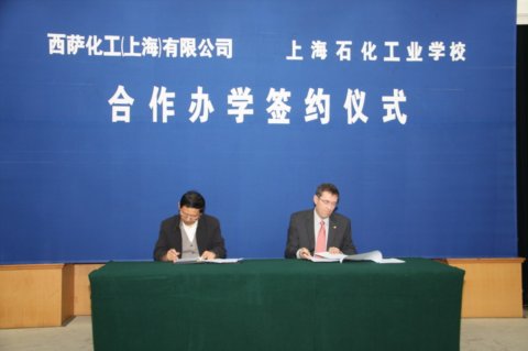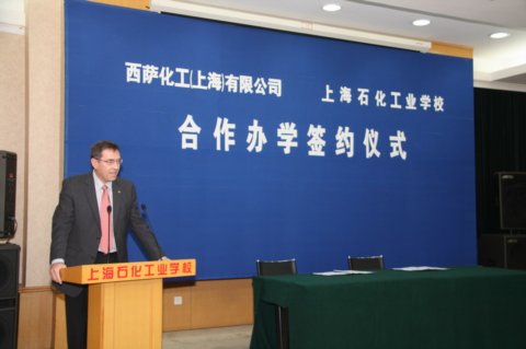 Mr Pierre Lahaie在仪式上致辞,感谢苏校长为双方合作办学带来的契机,感谢上海石化工业学校为培养高素质的员工付出的努力。他指出,西萨化工(上海)有限公司已在上海化工区开始施工,尽管工程壮观,但人才是公司的核心与将来,是公司最重要的财产。