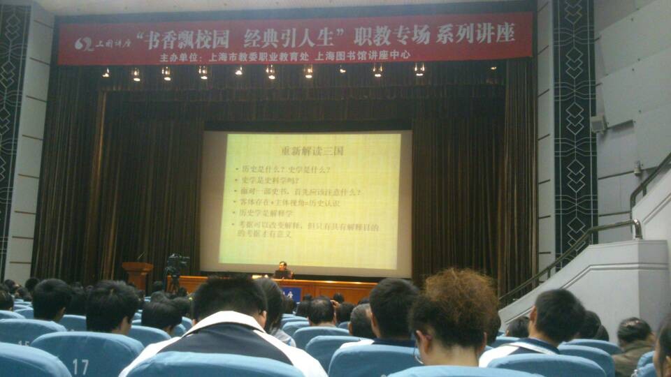 本次系列活动由市教委职教处携手上海图书馆,特别推出“书香飘校园 经典引人生”职教专场讲座活动,受到与会中职师生的好评。讲座的内容生动,活泼,有趣,把原本枯燥无味的历史完全换了一个姿态展现在我们面前。姜鹏教授的讲解,让过去和现在时光交替,使同学们又回到那个动荡不安的三国时代。同学们都听得津津有味,身临其境。