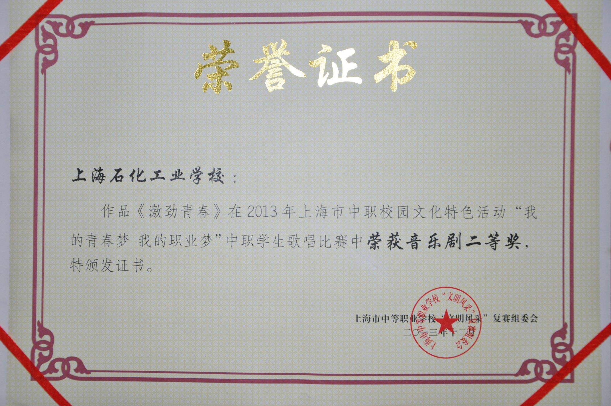 近日,上海市中等职业学校“文明风采”复赛组委会公布了2013年下半年上海市中职校园文化特色活动获奖名单,我校荣获首届音乐剧比赛团体二等奖。