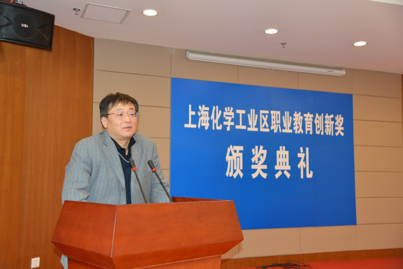 校长苏勇宣读了“上海化工区职业教育创新奖”获奖名单,前排就坐的领导为获奖师生颁奖。由黄祥健老师负责的中高职贯通化工专业必修课标准开发项目,康勇、凌朝晖老师负责的化工生产技术比赛培训等10个项目组获得“集体合作创新奖”,廖志君、黄悦等15位老师获得“个人工作创新奖”,197名同学获得“优秀学生奖”,103名同学获得“优秀学生奖单项奖”,49名同学获得“帮困助学奖”。