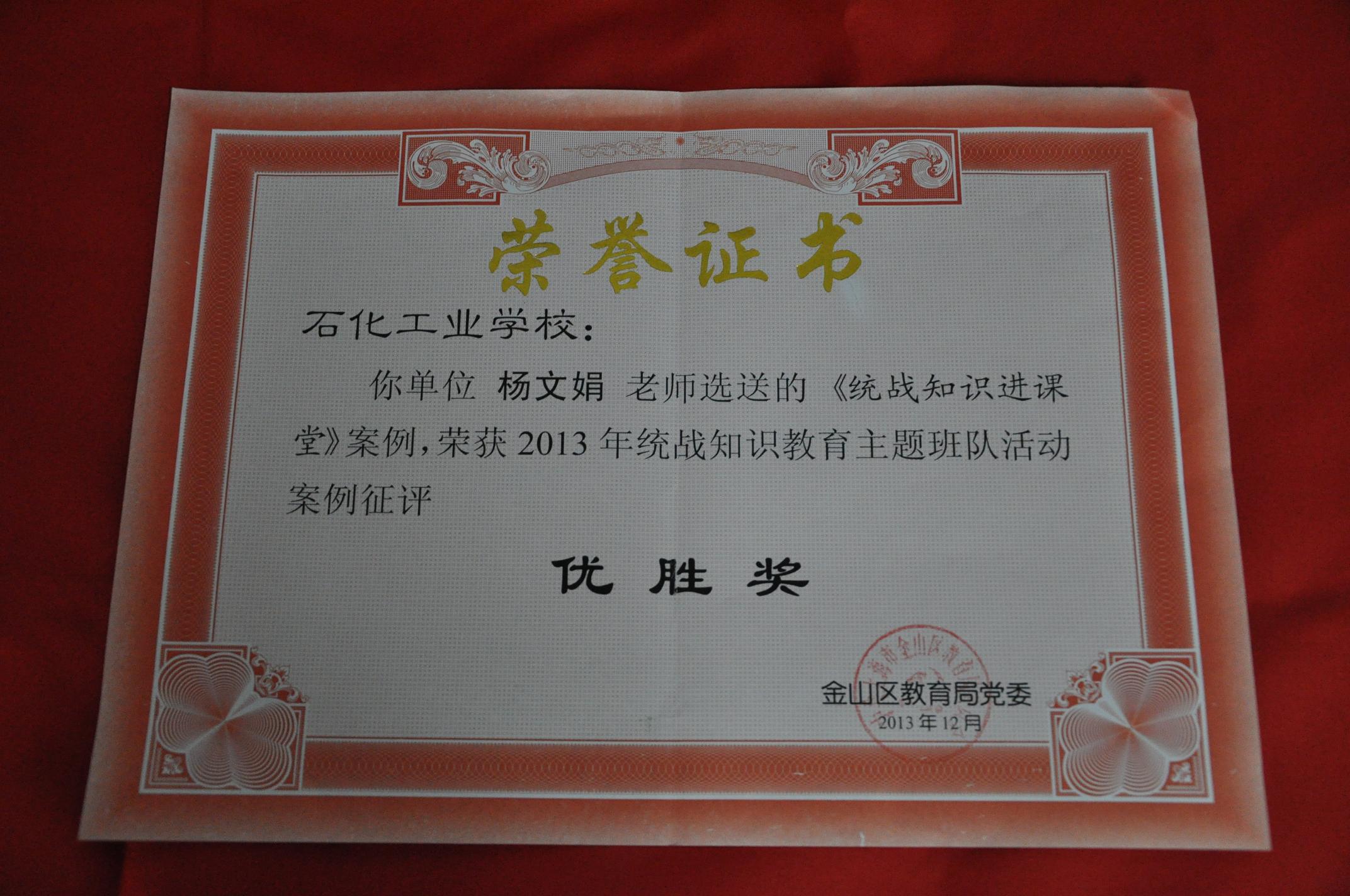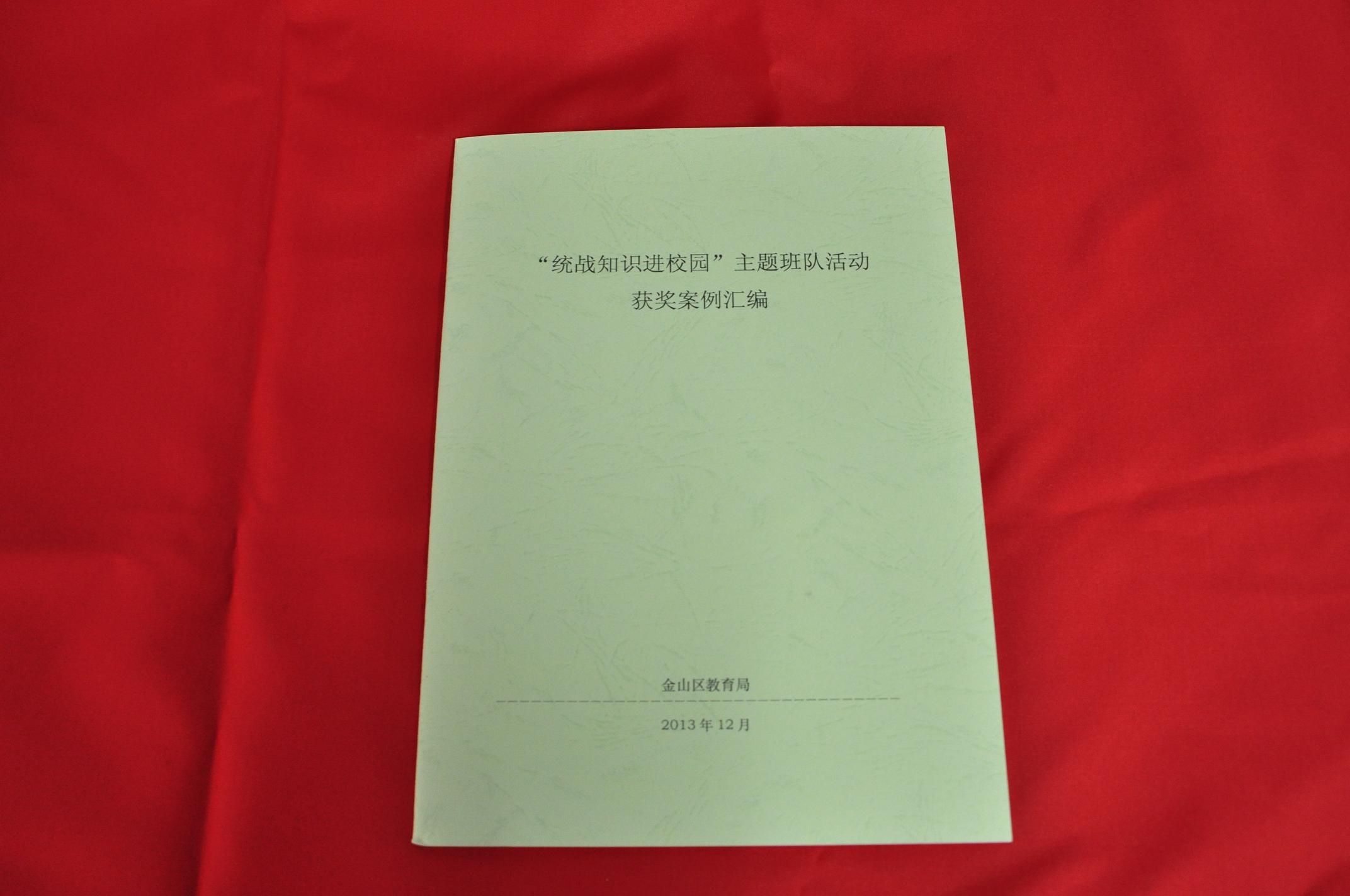 日前,金山区教育局党委举行《金山区统战知识竞赛和统战知识主题教育案例活动征评》颁奖会,杨文娟老师选送的《统战知识进课堂》案例,荣获2013年统战知识主题教育案例征评优胜奖,获奖案例汇编成册。(全区17篇)。