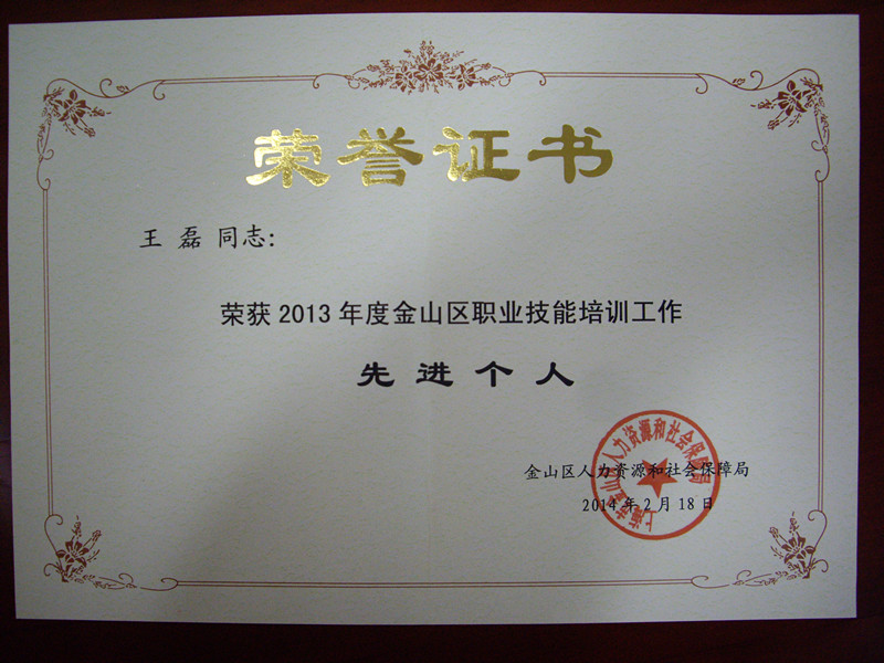 2月18日下午,金山区人社局召开了职业技能培训工作会议。会议明确了2014年全区职业技能培训目标任务,布置了本年度主要工作。同时下发了“关于表彰2013年金山区职业技能培训先进单位及先进个人的通知”,并向获奖单位和个人颁发了荣誉证书。培训中心被评为“2013年度金山区职业技能培训工作先进组织单位”,王磊被评为“2013年度金山区职业技能培训工作先进个人”。