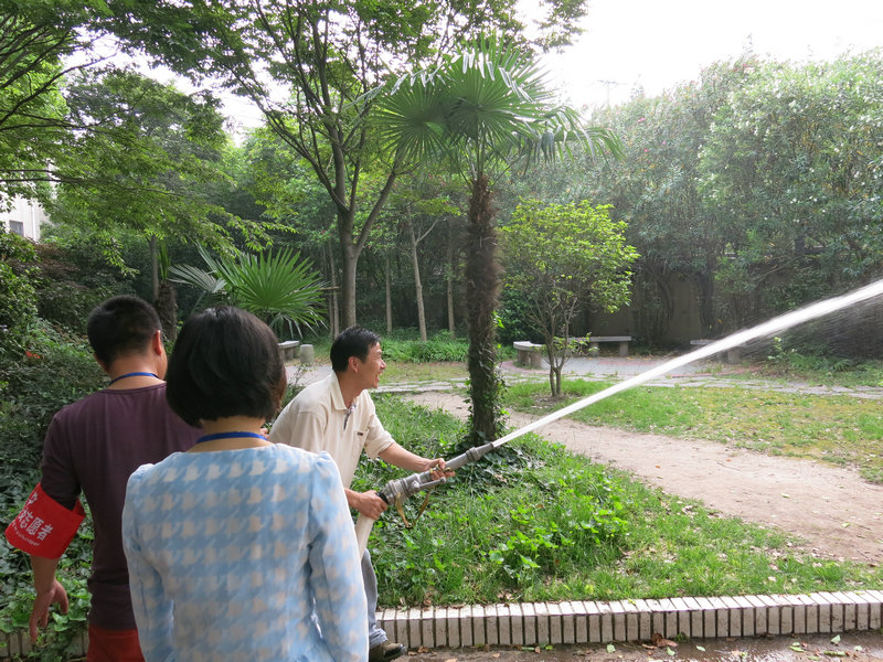 随着演练的开始,首先要求老师们在日常生活中,进入一幢楼一个新的环境先要熟悉疏散通道、掌握逃生技巧,在安保科老师的引导下,教师们对本幢宿舍楼的逃生通道进行了熟悉,并牢记在紧急情况下如何利用消防安全门进行正确的逃生。接着演练如何对初起火灾的扑救,大家逐一体验了一回如何使用各类灭火器针扑灭初起火灾,男教师更是对消防栓使用和水带灭火铺设等进行了体验。培训中每位老师对各种灭火过程兴趣浓厚,亲身体验了一回“义务消防员”过程。