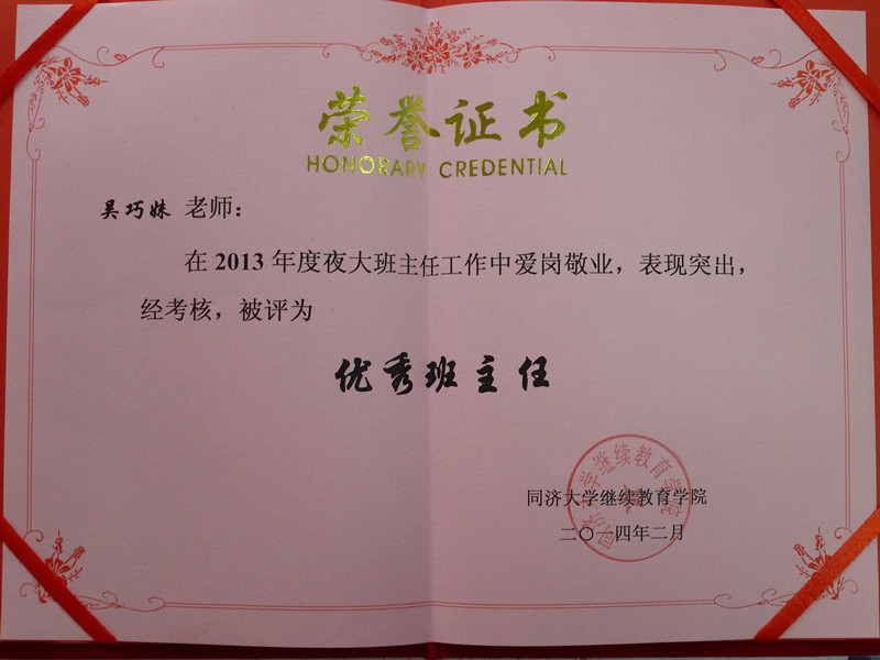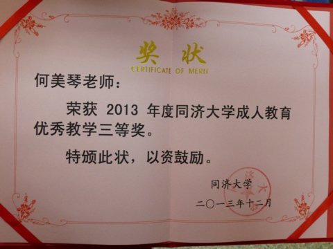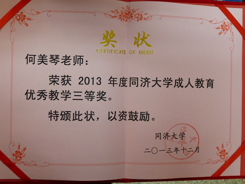 今年一月,培训中心任课教师何美琴曾获得“同济大学成人教育优秀教学三等奖”。她们是培训中心外聘教师和班主任队伍中的的佼佼者,为同济大学继续教育学院金山教学点的管理和发展做出了积极贡献。