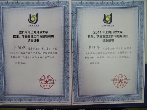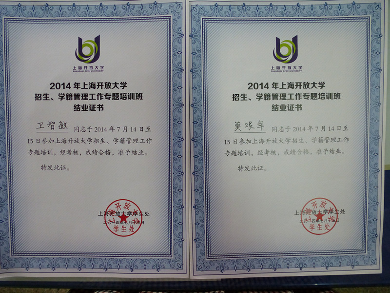 7月14日、15日两天,培训中心教职工卫智敏、莫艰幸参加了2014年上海开放大学招生、学籍管理工作专题培训班,并顺利通过考核,双双取得2014年上海开大招生、学籍管理工作专题培训班结业证书。