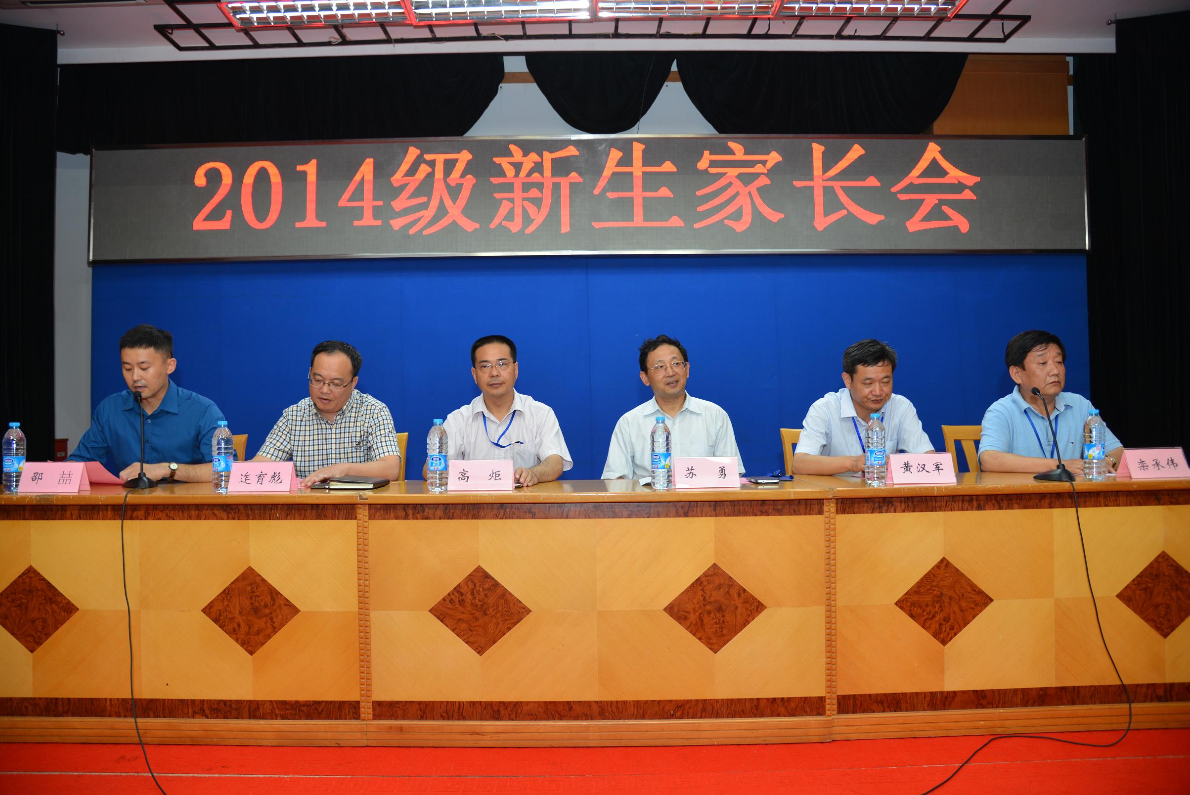 中午,在北校区B区报告厅召开2014级新生家长会。校长苏勇、副校长高炬、副校长黄汉军、教务处主任栾承伟及学生处主任迮育彪出席了本次会议。会议由团委副书记邵�老师主持。