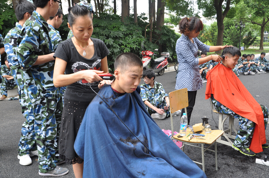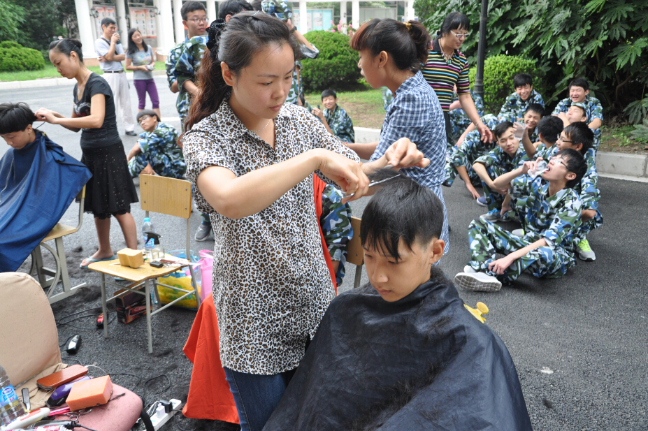 9月10日星期三,2014届军训的第二天,在学校的操场上,新一届的学生们正在认真艰苦的训练着,有的学生因为头发太长,不符合军队规范,学校为了让学生们体验军训的严肃和庄严,特地请来了理发师为他们规范发型,从“头”做起,从而提高思想意识。