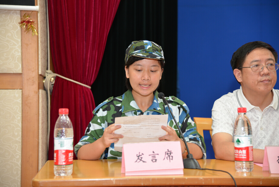 接下来,由141商务英语班的新生代表赵心语同学发言:感谢学校领导、教官以及老师的关心和支持。军训是一个崭新的课堂,教官们言传身教,不厌其烦的指导纠正我们。团结就是力量,不再是简简单单的一句话,而是靠我们每个人的同共努力。军训让我们学会自立、自强、自尊、自爱,让我们学会团结,让我们拥有坚强的意志。