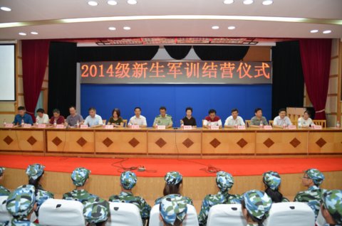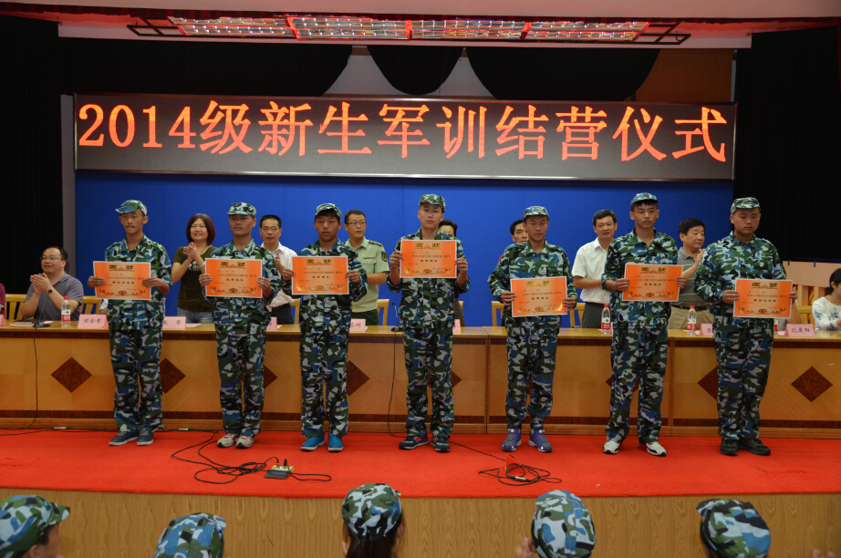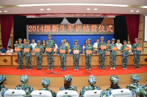 最后,主持人宣布:“上海石化工业学校2014级新生军训结营仪式到此结束”。