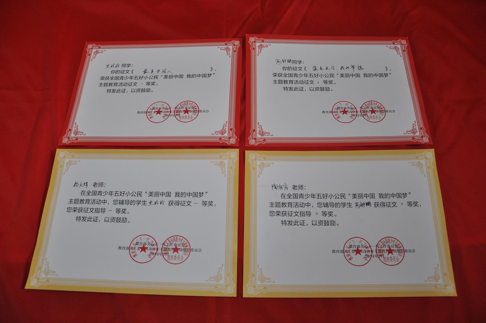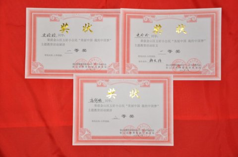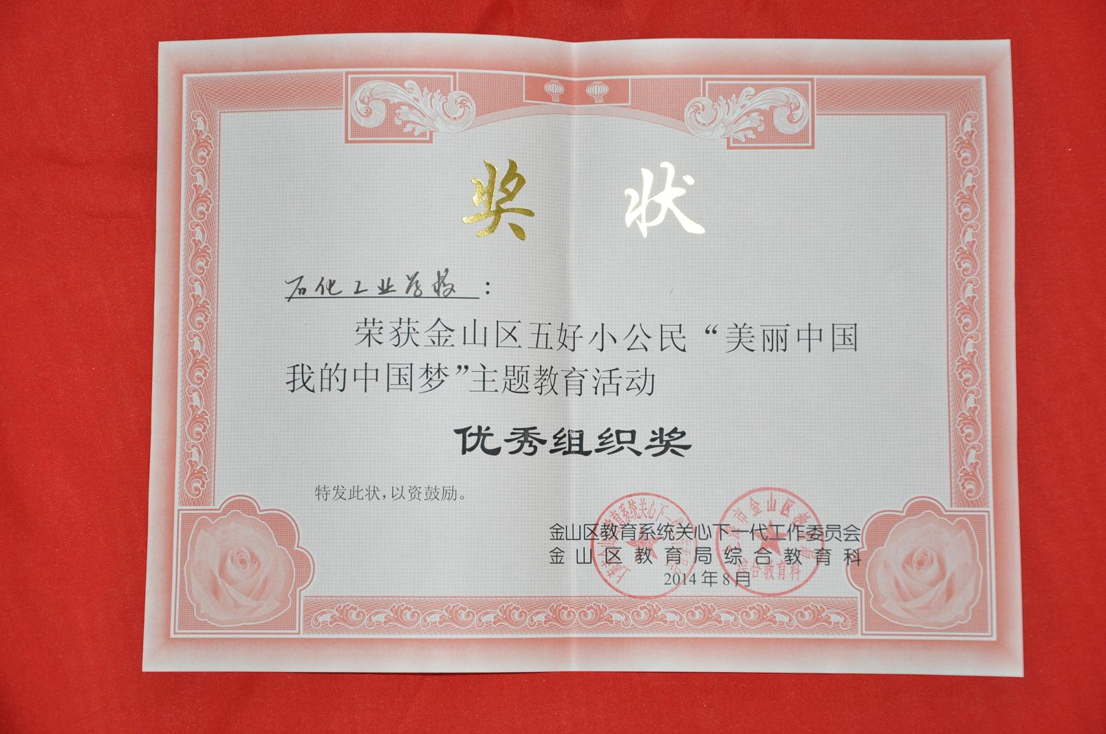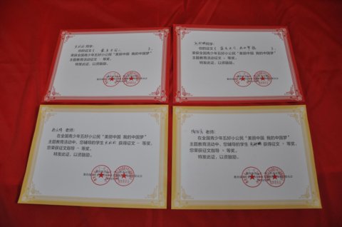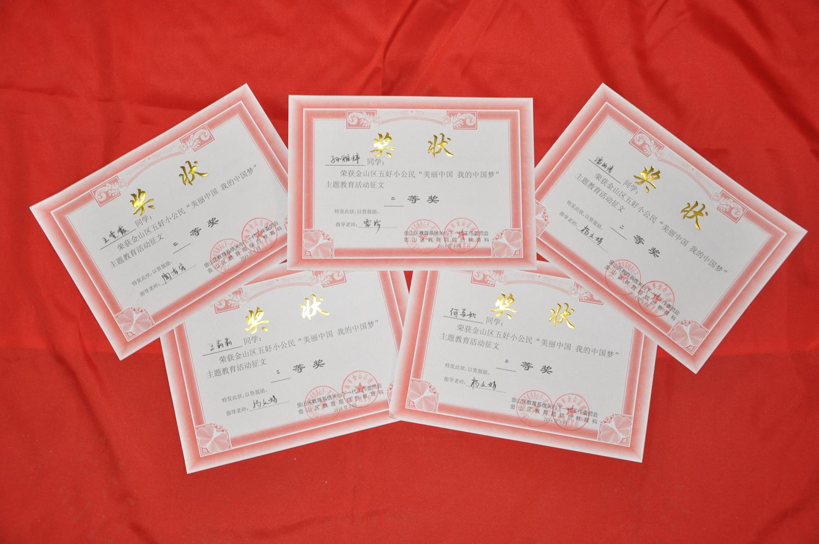 2014年7月教育部关工委全国青少年主题教育活动组委会进行表彰活动,近日教育部、金山区教育局颁发各类奖状。