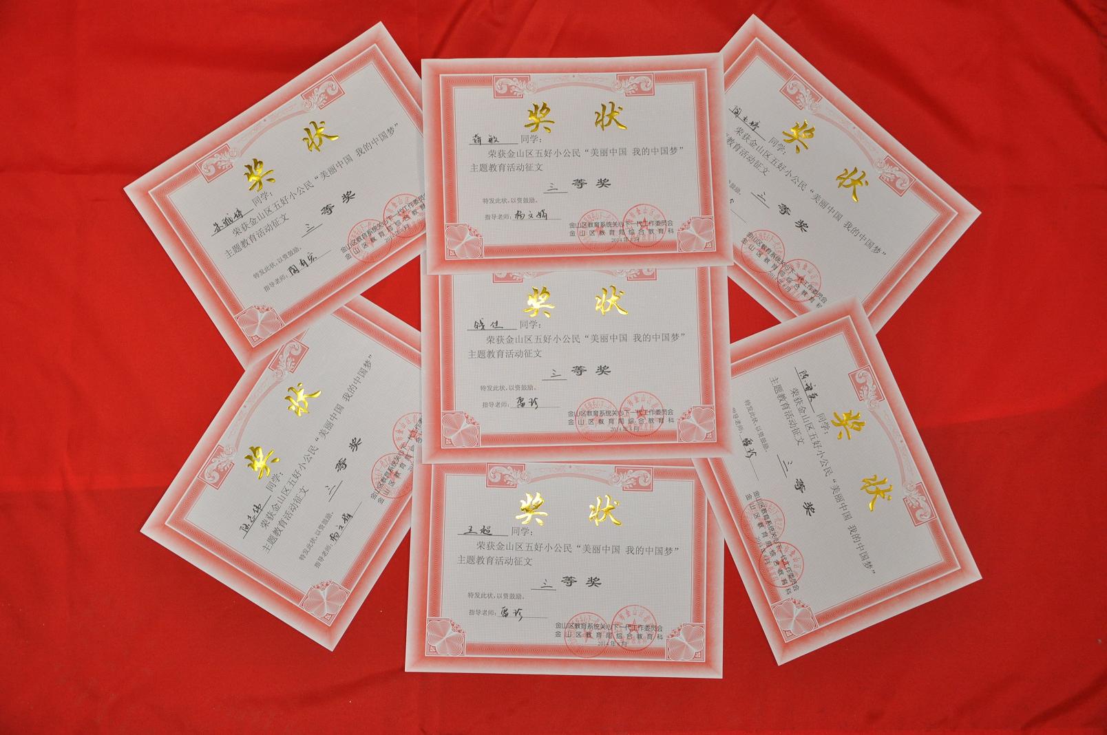全国青少年五好小公民“美丽中国,我的中国梦”主题教育活动征文比赛中,杨文娟老师指导111物流2班史玲玲同学《最美中国人》征文获得一等奖;陶有宏老师指导120应用化工高舒鹏《蓝色天空 我的梦想》征文获得二等奖。金山区全国青少年五好小公民“美丽中国,我的中国梦”主题教育读书活动征文比赛,一等奖1名,二等奖5名;三等奖7名。