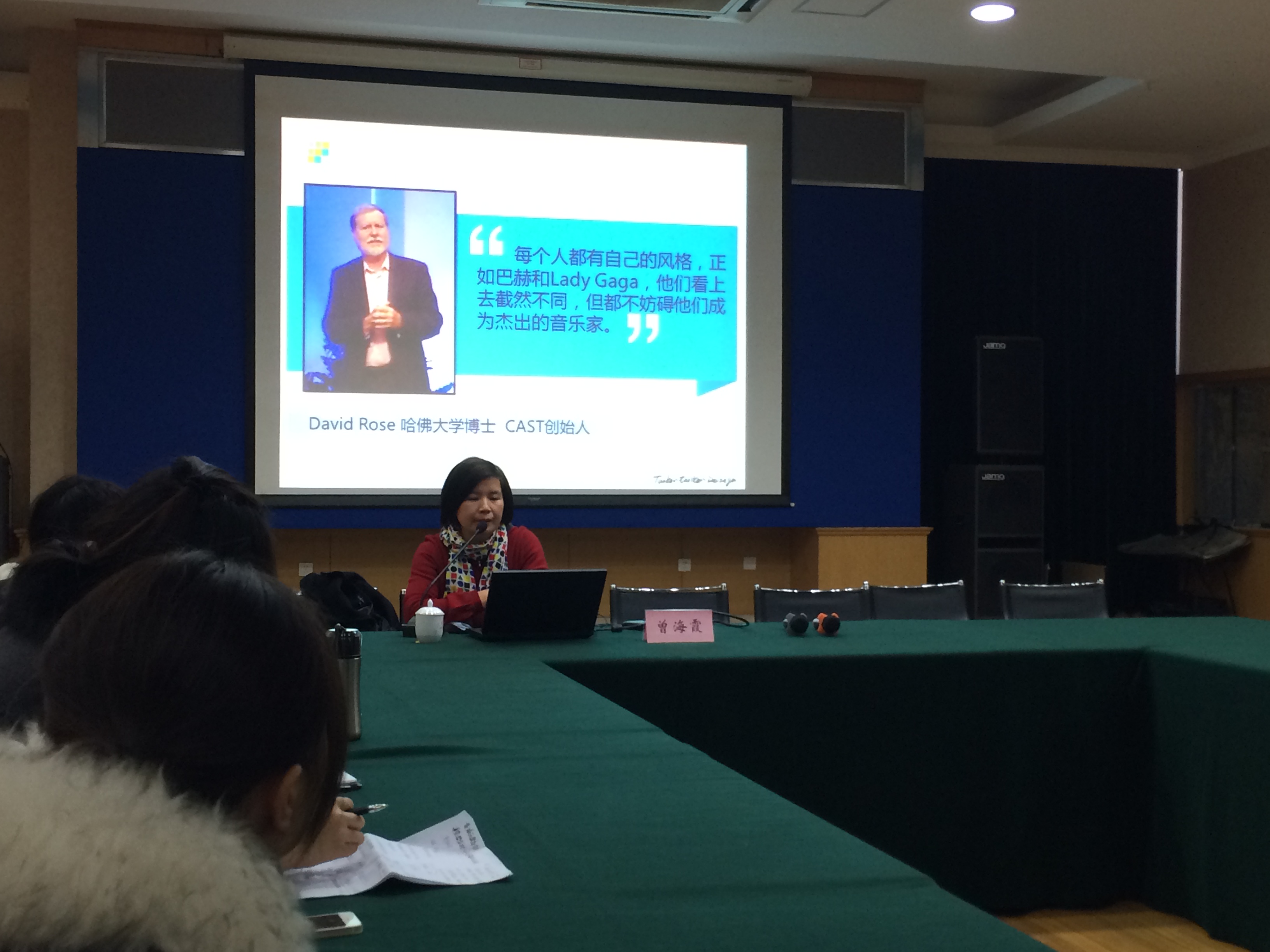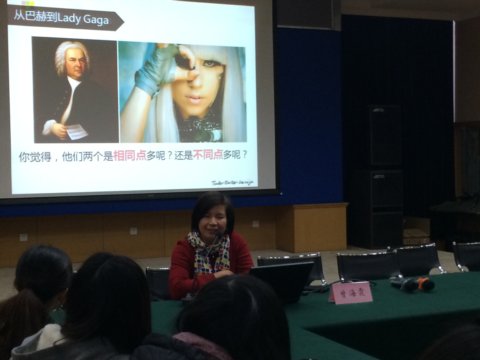 在构成要素方面,曾老师将学生放在了首位,她说教学首先要研究“我们的学生是怎样的?”并援引哈佛博士、CAST创始人David Rose 在比较巴赫与Lady Gaga后得出的结论,“每个人都有自己的风格,正如巴赫和Lady Gaga,他们看上去截然不同,但都不妨碍他们成为杰出的音乐家。而我们教育者一直在追求给我们的学生一种统一的教学设计,希望用一种方法把所有的学生教育成才。这其实是一种很大的误区。”现代脑科学研究已经发现学生的大脑神经特质是不同的,要实现个别化的教育需要做好两点准备,从认识上承认每个学生的差异,从技术上要能够测评呈现这种差异。曾老师的一句话使大家陷入深深的思考“也许,并不是学生们的能力不够,而是我们没有找到欣赏他们的技术与视角。”在课堂教学过程中强化“假如我是学生”的意识,做一个“会放风筝的人”才有助于走出课堂困境,构建和谐课堂。说到教师这一因素,曾老师将一个教师的成长分为模仿、创新和成熟三个阶段。她鼓励在场的教师形成自己的教学风格,坚持三问“我是什么?”、“我有什么?”、“我没有什么?”进行角色定位和自我剖析,通过拜师学艺与自我研习、优势培养与弱点逆转、作品分析与模仿感受等策略来形成自己的风格。教学内容是实现教学目标的主要载体,曾老师结合自己的成长经历说明了教学内容需要选择,不能被教材束缚,而在进行内容选择的时候要依据教学目标、学生特点、社会发展需要和课程内容本身的性质。