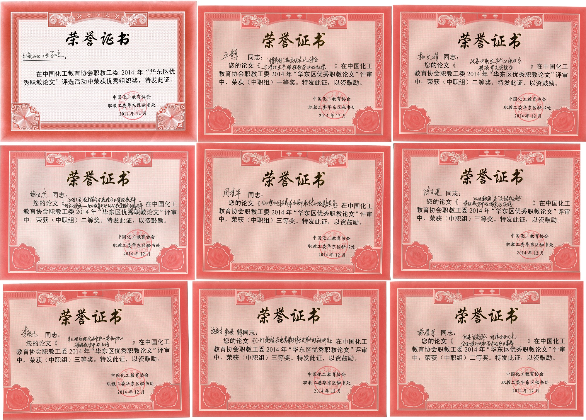由中国化工教育协会职教工委华东区协作组举办的“中国化工教育协会华东区协作组2014年优秀职教论文”评选结果已于日前揭晓,本次论文评审分高职、中职两个组别进行,各组别分设一、二、三等奖,中职组共有64篇论文参与评审,共评出一等奖3名,二等奖6名,三等奖18名。我校选送的论文在此次评选中成绩斐然,此次我校共选送了10篇论文参加评选,8篇得奖,占此次华东区中职组获奖总数的30%,我校也因此荣获此次论文评选的优秀组织奖。