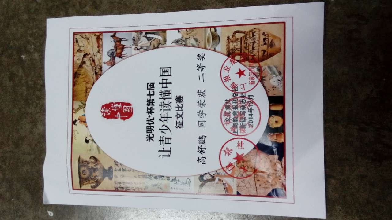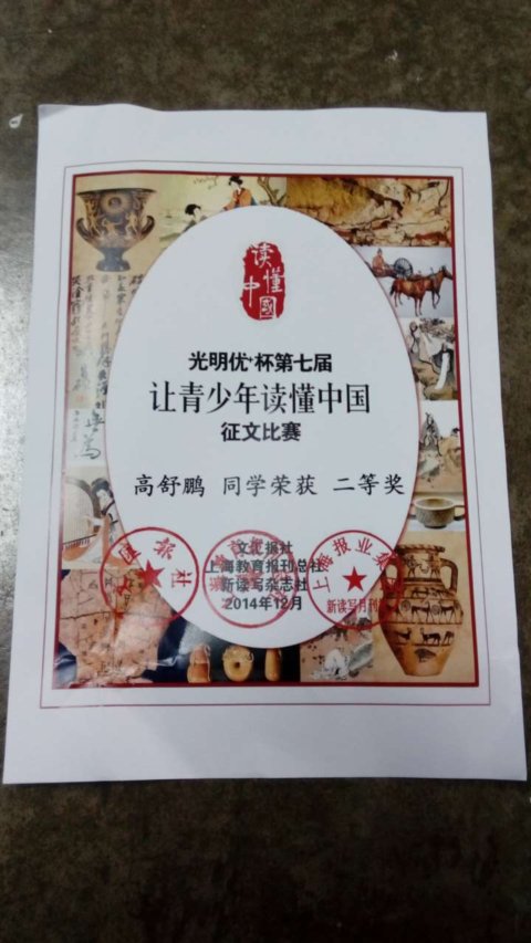 近期,在上海教育报刊总社剧场举行第七届光明杯“让青少年读懂中国”系列活动颁奖大会,由陶有宏老师指导的120应用化工班高舒鹏同学荣获征文决赛高中组二等奖。