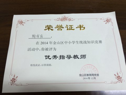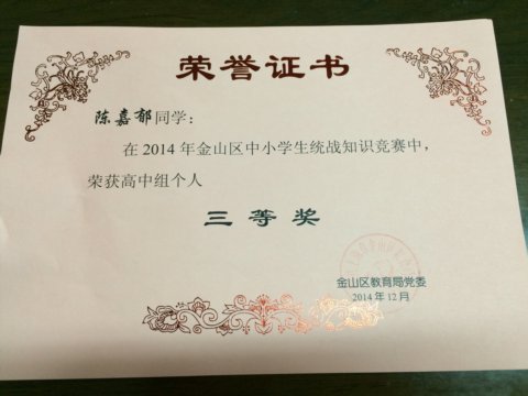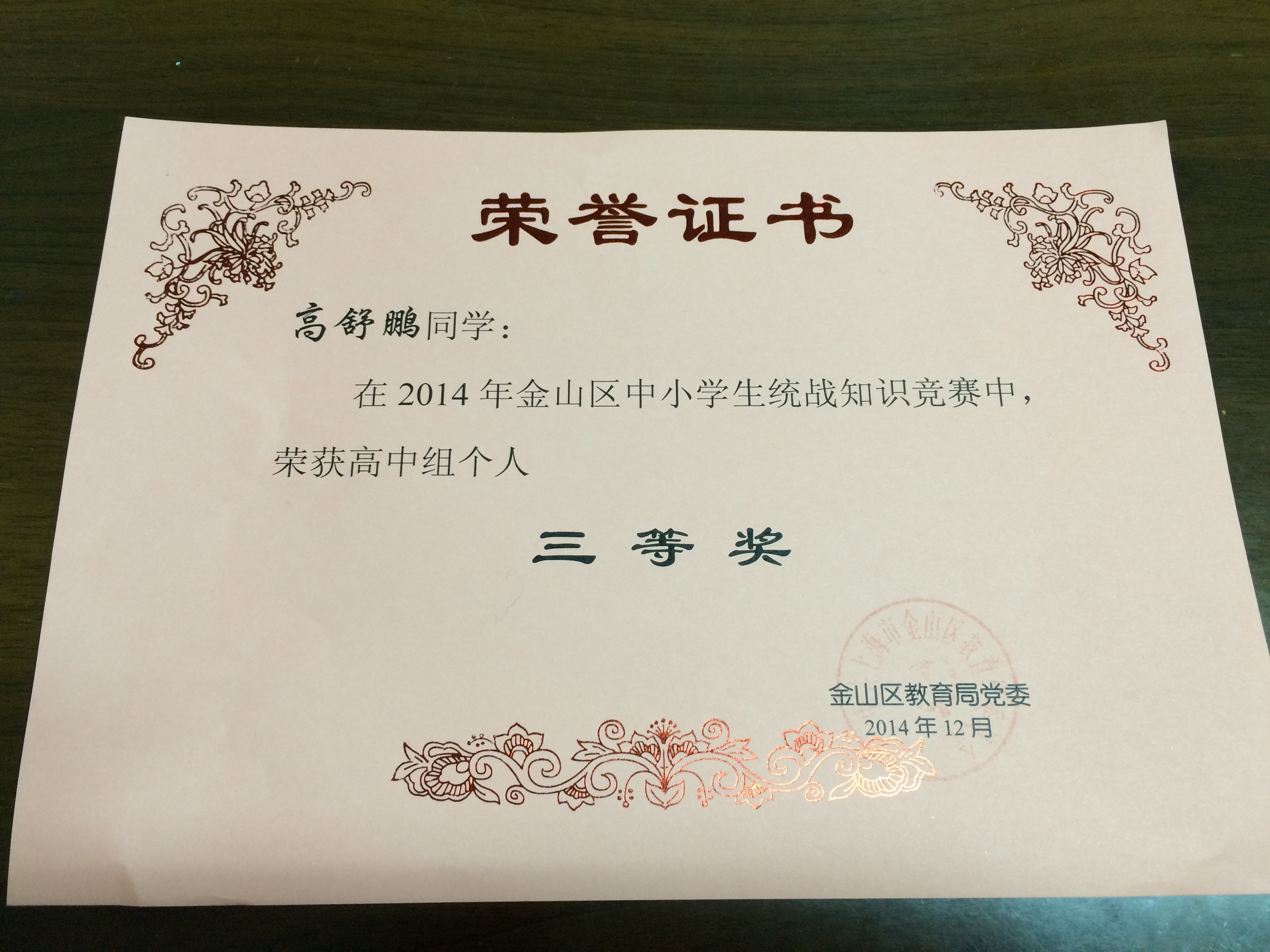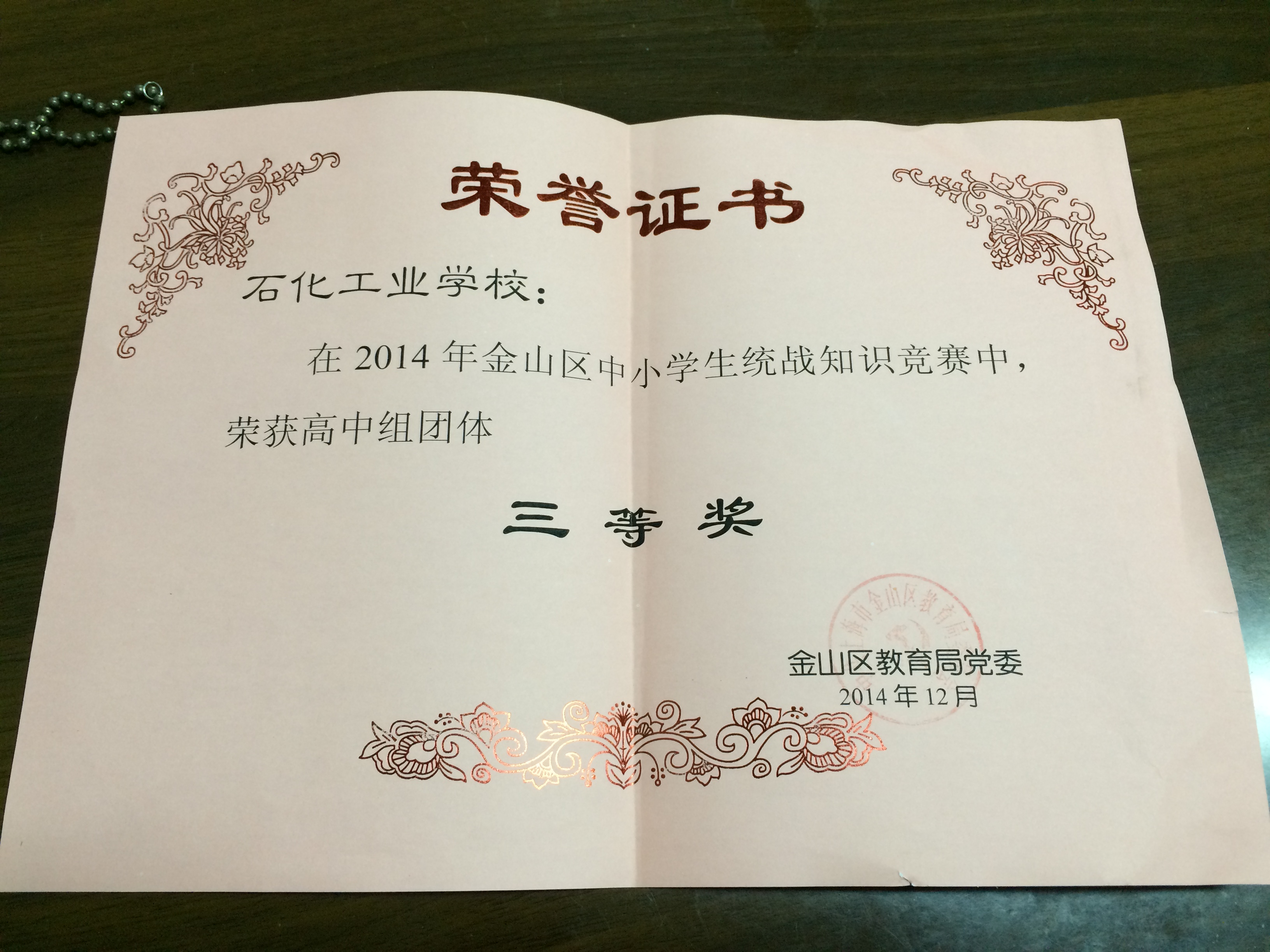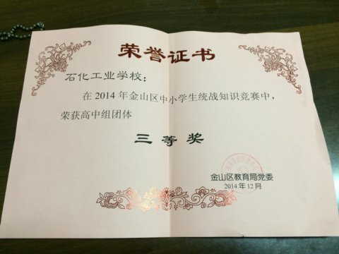 近日,2014金山区中小学“统战知识”竞赛在蒙山中学如期举行。我校学生积极参赛,认真细致地答题,获得了团体三等奖,120应用化工陈嘉郁和高舒鹏还分别获得了个人三等奖。