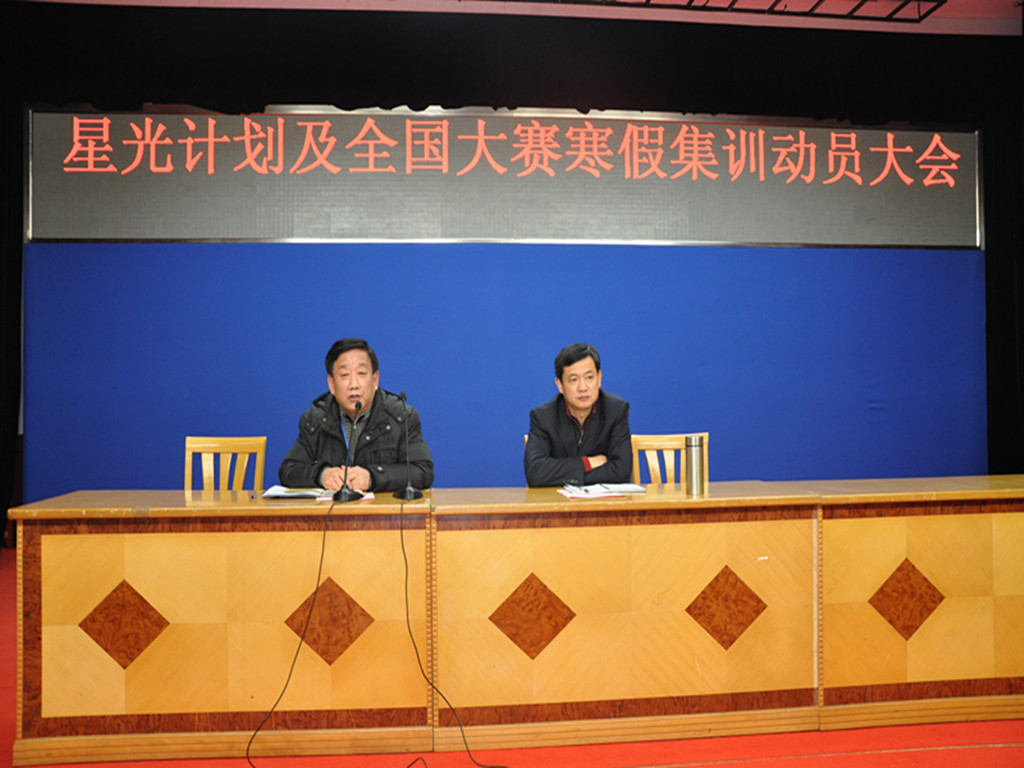 栾主任首先对经过海选、再由市教委统一抽定的这90名参赛同学表示祝贺,他说,这些同学能够代表学校去参加市级大赛是幸运的,也是光荣的,同时,能亲身参加寒假集训和比赛也是难得的机遇和挑战,希望同学们能够珍惜机会。接着,他就我校“星光计划”寒假集训的基本要求及注意事项对全体到会学生和教师作了宣讲,以期让各位家长能更加了解、更进一步支持学校工作,也为各位参赛选手加油鼓劲。栾主任还从如何抓住人生机遇,结合大赛的竞技要求,对大家提出了训练要求:充分认识赛前集训的必要性,以饱满的精神、认真的态度、严谨的作风投入其中。抓紧每一天的宝贵时间,从严训练,使自己练得一手好功夫,为大赛做好准备,同时也为自己打下扎实的专业技能,为今后的人生奠基。同时他要求,同学们必须严格遵守学校制定的训练纪律,营造良好的训练氛围。