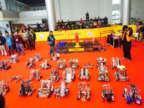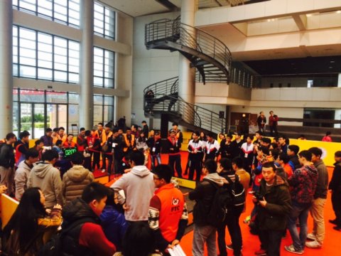 3月14日,在上海同济大学的同德楼大厅内,人声鼎沸,来参加一年一度的FTC科技挑战赛上海大区赛的同学们分散其中,大家或热烈的讨论,或认真调试修改机器,或一丝不苟的在电脑上调试最后的编程程序,空气中一派紧张而又有序的氛围。