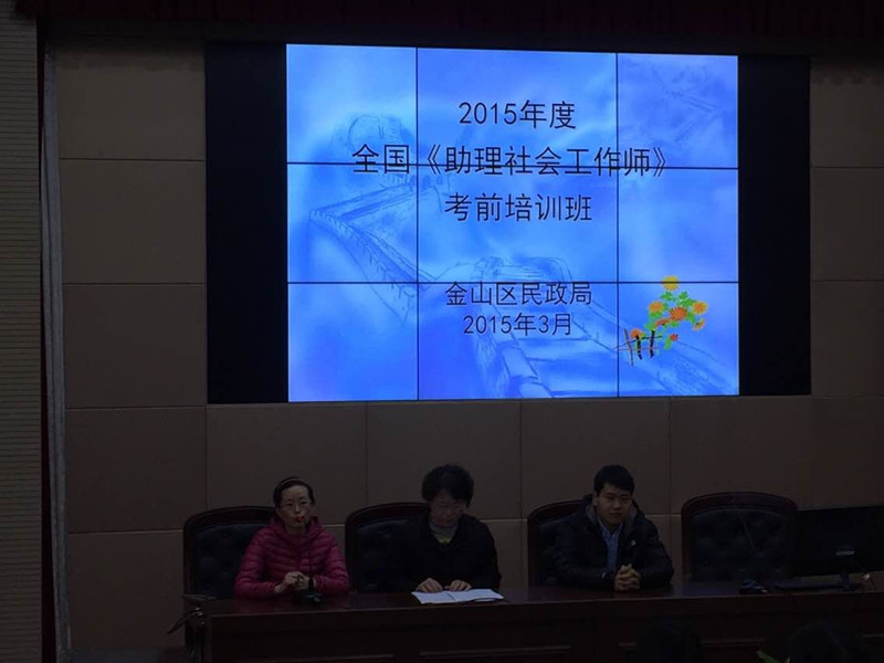 据悉,目前金山区社工队伍的持证率很低,不适应社会管理新常态。为了加快推进全区各领域社工专业人才队伍建设,强化社区工作者队伍管理,提升社区工作专业化、职业化水平,区民政局根据市委“1+6”文件精神和区委2015年重点工作部署,日前启动“社工人才队伍建设2015-2017三年培训计划”。并在区人社局的支持协调下,特委托培训中心负责将于6月14日举行的2015年度国家民政部社会工作者《助理社会工作师》职业水平考试的考前培训办班。首期培训安排开设石化、朱泾两个班,共计学员322人。3月26日、27日起至5月中、下旬安排7天《社会工作综合能力》、《社会工作实务》科目的考前辅导。特聘上海华东理工大学社会与公共管理学院社会工作系教师、社工专业的博士授课。