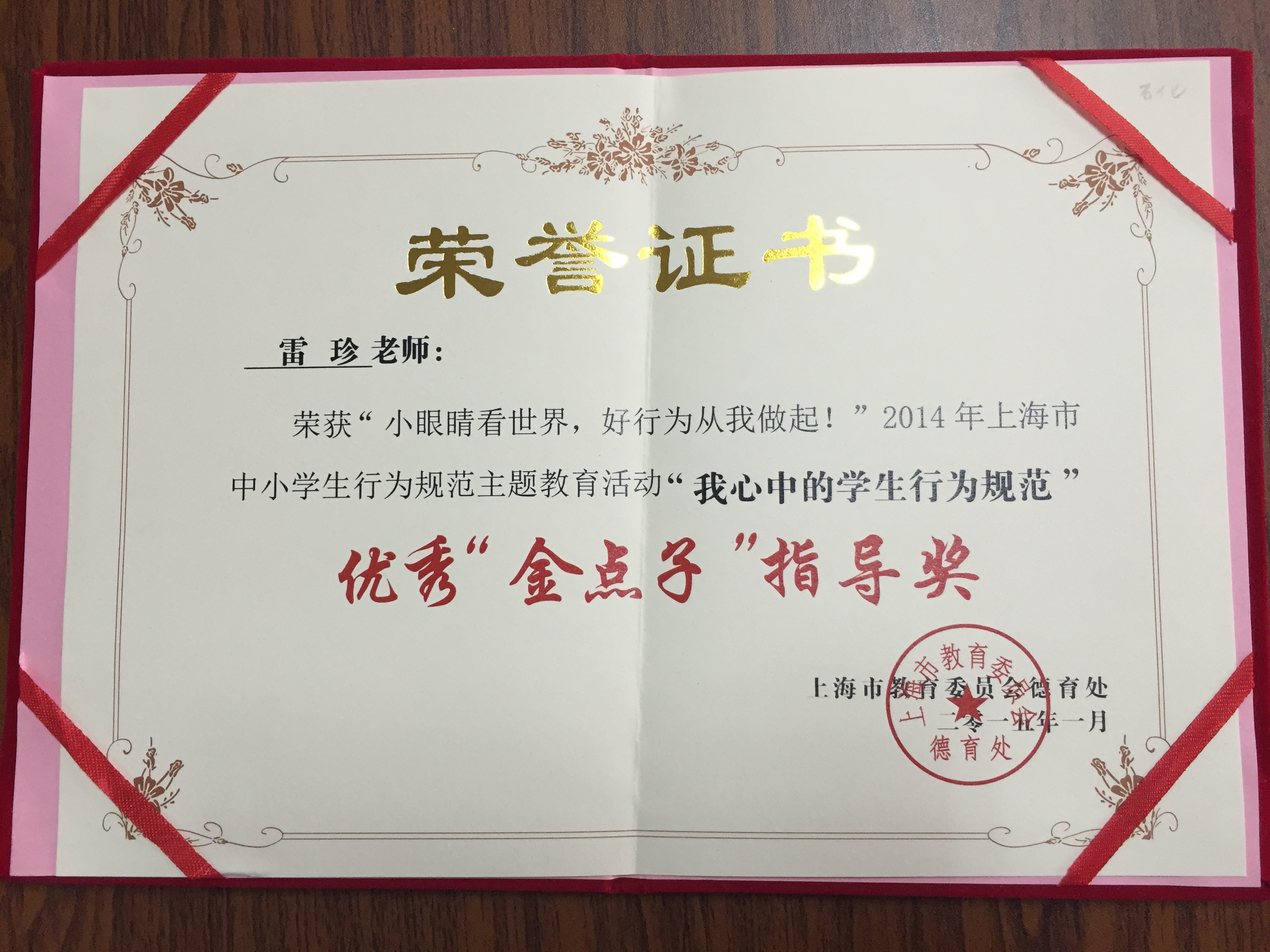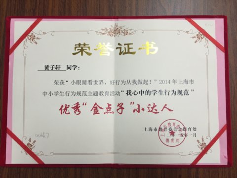 近日,“小眼睛看世界,好行为从我做起”2014年上海市中小学生行为规范主题教育活动圆满落幕。我校121高复7班黄子轩同学荣获“我心中的学生行为规范”优秀“金点子”小达人,语文组雷珍老师荣获优秀“金点子”指导奖。