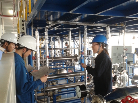 上课前,何老师强调做好安全工作,让学生穿好实训服与实训鞋,并戴上安全帽。由于传热的课程内容是在前半学期讲授的,为帮助学生记忆,在课程的开始部分,何老师先与同学们一起复习了传热的大致流程与内容,提问学生本套传热装置使用的冷、热流体分别是什么,并提出本次实训课程的主要任务是完成传热的开车操作。