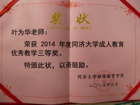 据悉,2014年度“四优”评选之前,培训中心同济夜大班任课教师叶为华已荣获2014年度同济大学成人教育“优秀教学三等奖”。