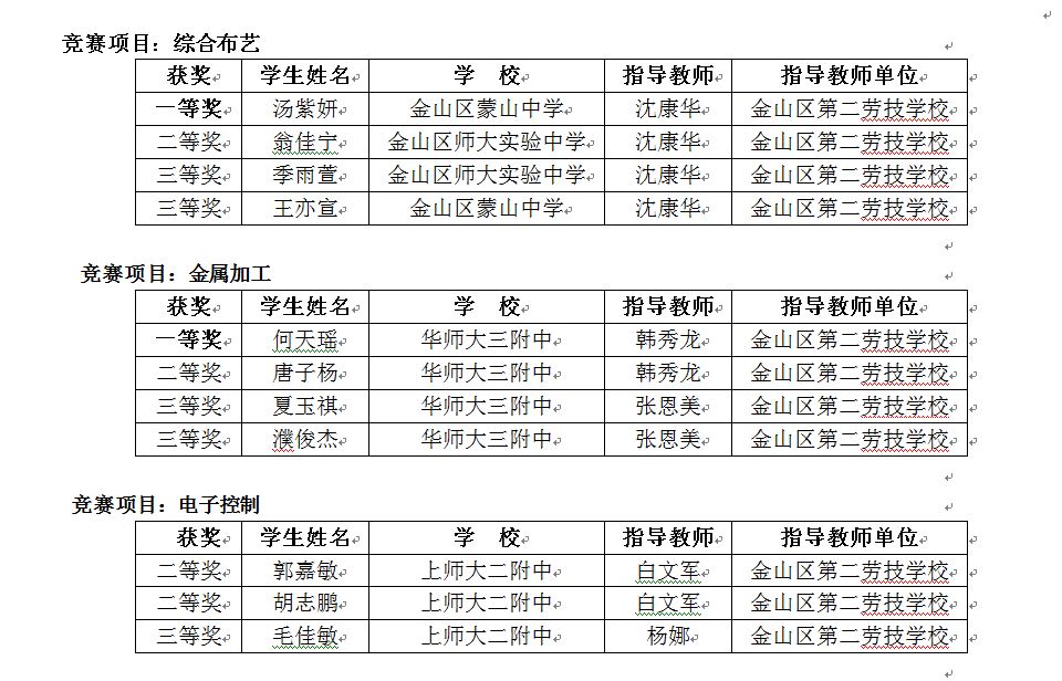 6月初,经过两个多月的训练与指导,我区劳技师生代表赶赴市区参与了2015年上海市中学劳技学科竞赛。今天,佳绩传来,金山区派出22名学生,共18人获奖,其中一等奖3名,二等奖8名,三等奖7名,如此佳绩是我区的一大突破,并因此获得上海市劳技竞赛团体三等奖,这也是我区第一次获此殊荣。我校劳技中心也在其中做出了巨大的贡献,其中劳技中心共派出12名同学,2名一等奖,4名二等奖,5名三等奖,11名获奖,实力不容小觑。