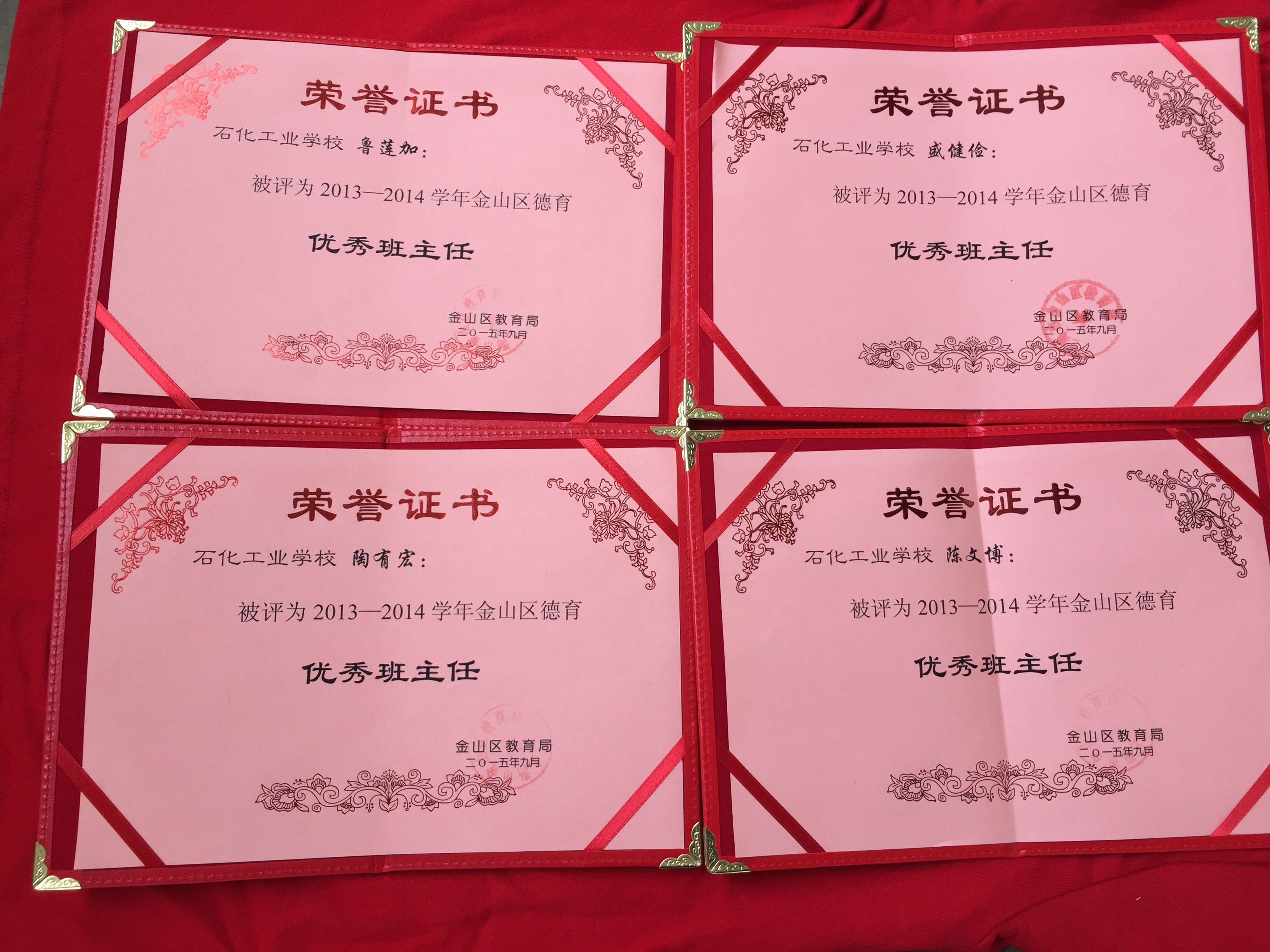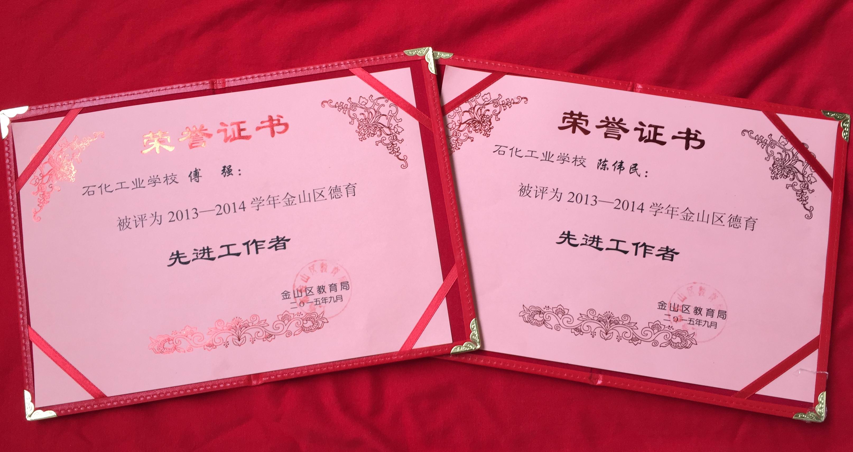 近日,2013―2014年金山区学校德育工作先进集体、先进工作者、优秀班主任的获奖名单公布。傅强和陈伟民老师被评为“德育先进工作者”,鲁莲加、陶有宏、陈文博、盛健俭等四位老师被评为“优秀班主任”。