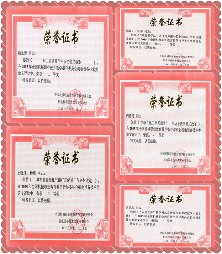 其中陆震和王跃华老师的《“项目教学法”在<电力拖动控制线路>中的应用实践》、周艳玲老师的论文《中职“化工单元操作”工作场景教学模式改革》、徐卫东老师的《“五员六步”教学模式在数控专业课程教学中的实践》荣获一等奖;陆永忠老师的《车工实训教学中安全性的探讨》荣获二等奖;王晓彦和杨赳老师的《减粘装置裂化气螺杆压缩机干气密封改造》荣获三等奖。