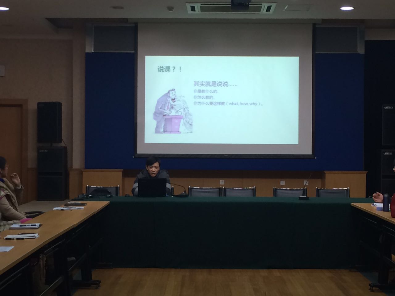 朱文俊老师对两位主讲人的讲座过程及讲座内容进行了总结,并结合上届教学法竞赛中胡丽丹老师的课指出“实际上课过程中难免出现与预设不相符的偏差及瑕疵,而说课恰恰是对上课过程中偏差的弥补。因此说课不仅要关注到预设情形,同时要对课堂中的生成性问题进行巧妙解答”。在场各位纷纷表示赞同。