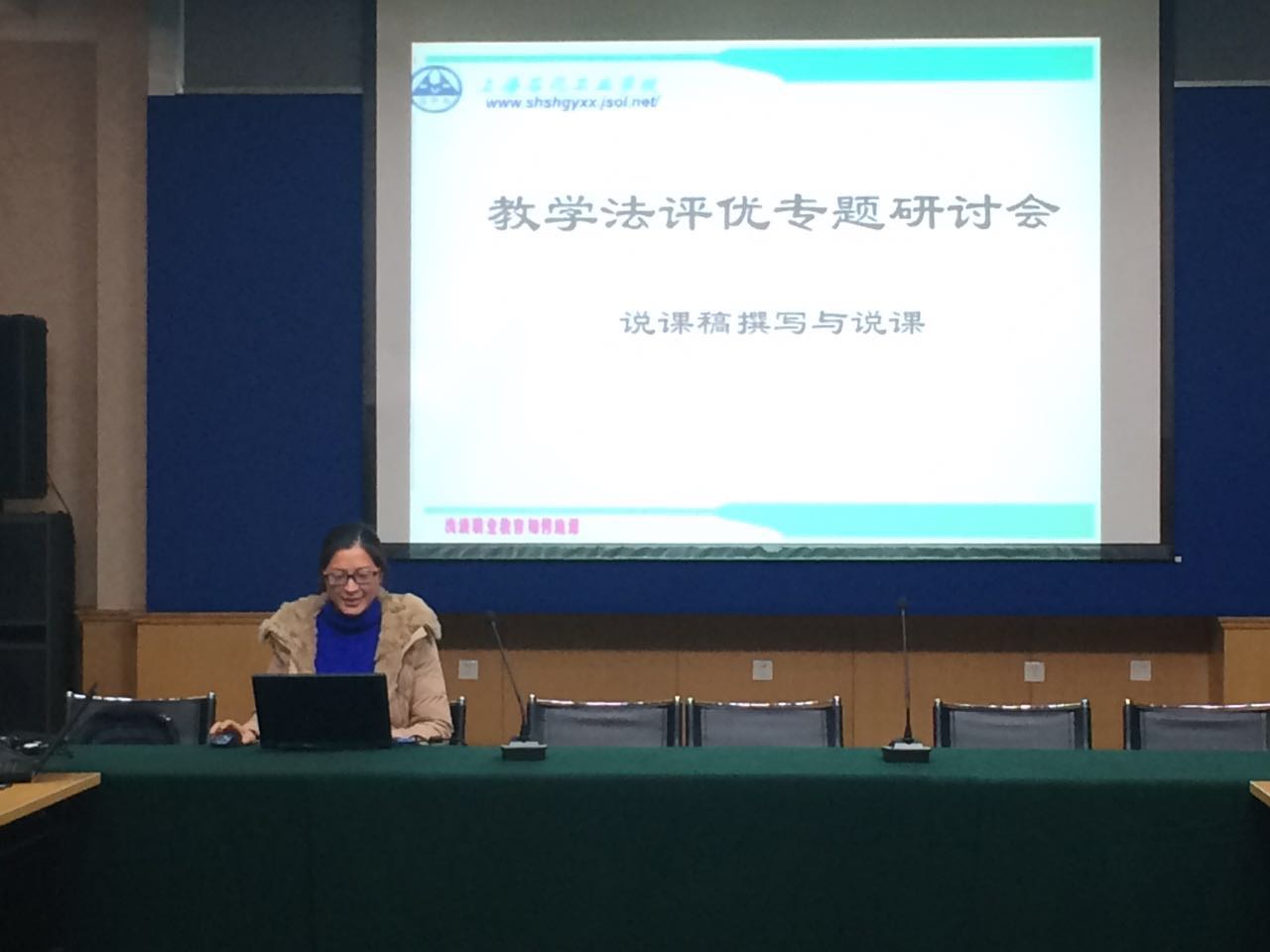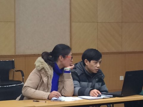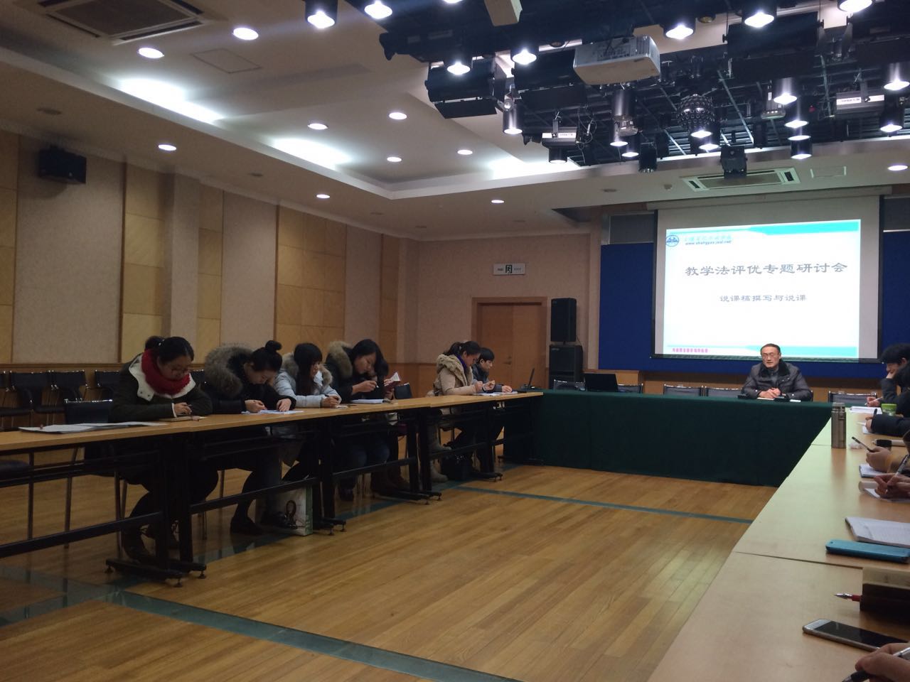12日下午,多功能厅座无虚席,经学校选拔参加上海市第七届教学法竞赛的选手及其项目组成员早早就来到这里,三个专业科的负责人及教务主任也都前来参加。大家或交流近期的生活、或就刚刚结束的期末考试进行评论、或猜测今天的主讲人会带来怎样的内容。虽然这样的场合对于两位主讲人来说已经不是第一次,但在这次研讨之前两位主讲人仍是就主讲内容及分工等进行了多次交流,当天他们也提前到来,在研讨正式开始之前,两位主讲人还在一旁就研讨形式等进行沟通。
