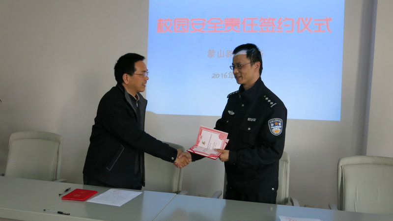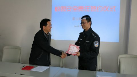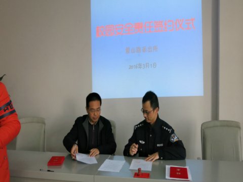 3月1日下午,金山区治安保卫责任签约仪式于在蒙山路派出所举行, 蒙山路派出所与辖区的16所中小学校(幼儿园)分管安全的领导出席仪式,我校分管安全工作的副校长高炬出席仪式。