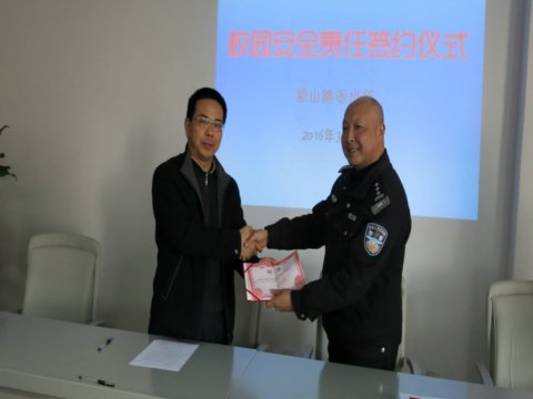 最后,学校和派出所签署治安保卫工作责任书,我校聘请副所长谢永刚为校外法制副校长、殷群警官为治安辅导员。