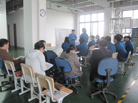 在新课环节,张老师首先让学生说出精馏装置开车的主要部分:开车前的准备工作、塔釜进料、开启再沸器、开启冷凝器。因每一个操作步骤中包含了大量需要记忆的步骤,学生均反映很难在短时间内掌握步骤。这时,张老师按照考试要求,亲自在装置上示范操作,以简单幽默的形式让学生对精馏的开车考试的步骤有了清晰明了的印象,她又编了一个顺口溜,让学生去记忆开车操作步骤,学生在轻松愉快的气氛中轻松地记住了开车操作步骤。