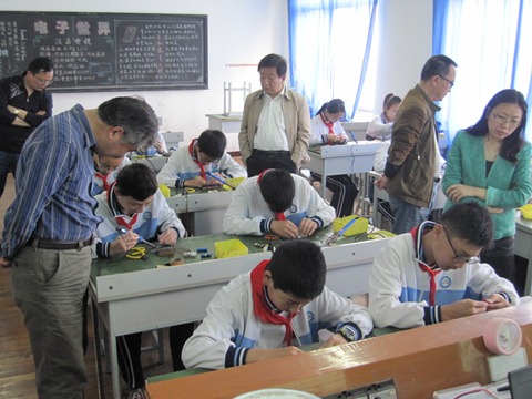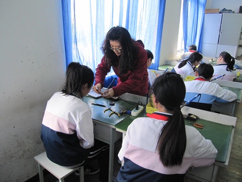 首先,杨娜老师复习了电阻的测量方法,以色环法和万用表法的具体应用和学生展开互动,将学生注意力集中,并顺利引出本节课的主题――电阻对电路电流的影响。接着,杨老师引导学生开展实践任务一、二、三,让学生分阶段焊接电阻R1、R2,R3及跨接线,并通过观察电路板,得到三种电阻连接情况下的二极管亮度。亮度的极大变化,引起了学生们的学习兴趣。最后,杨老师引出课下探索任务,对学生课下的探索指明了方向,并启发学生更多的思考。