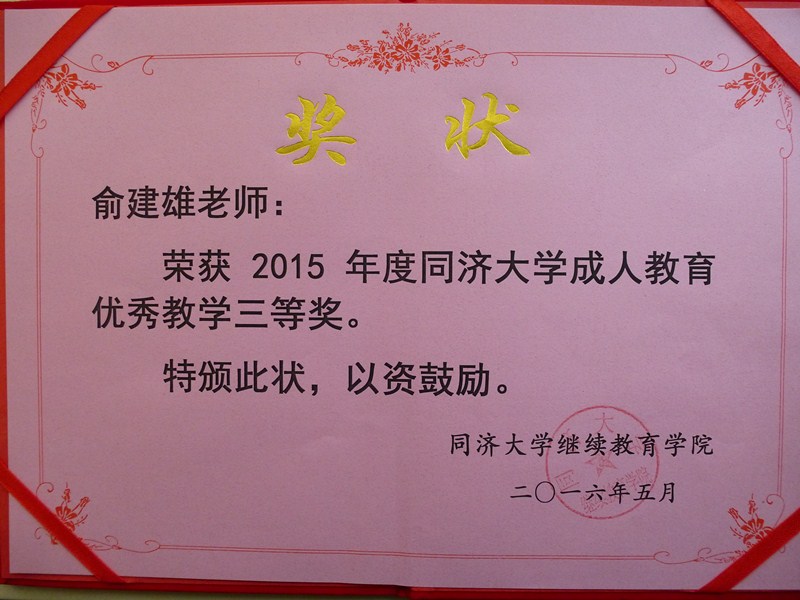 我校培训中心学历部在任课老师的辛勤教育、班主任的严格管理和同学们努力下,共有 34人获奖。俞建雄、黄祥健荣获“2015年度同济大学成人教育优秀教学三等奖”,莫艰幸被评为“2015年度爱岗敬业优秀班主任”,漆伟明、晏正被评为“2016届优秀毕业生”,朱辉等10位同学被评为“2015年度优秀学生干部”,干海涛等22位同学被评为“2015年度优秀学生”。谭佳等七位同学分别代表优秀毕业生、优秀学生和优秀学生干部上台领奖。获奖学生纷纷表示在今后要更加努力学习,把学到的知识运用于日常的工作学习,来回报学校的辛勤栽培。