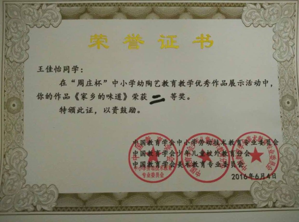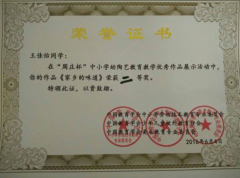 本学期开学初,市教委教研室发布通知,在全市范围内组织学生作品参加“周庄杯”中小学幼陶艺教育教学作品竞赛。接到通知后,曹老师针对前来劳技中心进行陶艺学习的华师大三附中高一学生精心辅导和重点指导,最后,挑选了8件作品的照片参加比赛。经过市陶艺专家的初评审核,最终一件作品入围,获邀参加在周庄举行的终评展示活动。本次活动共有全国28个省、自治区和直辖市推荐的900多件作品参与评选,在中学组、小学组和幼儿组中各设一、二、三等奖。经过激烈的评选,最终华师大三附中王佳怡同学的作品《家乡的味道》荣获二等奖。