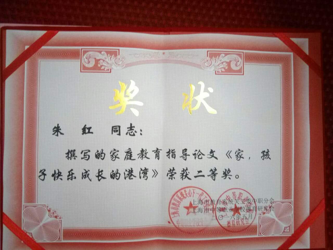 2016年6月7日,上海市中等职业学校家庭教育工作推进会暨《人生第一课堂》―上海中等职业学校家庭教育指导论文集首发仪式,在上海新闻出版职业技术学校举行。我校家委会主任(140化学工程班学生家长)朱红同志撰写的家庭教育指导论文《家,孩子快乐成长的港湾》荣获二等奖。