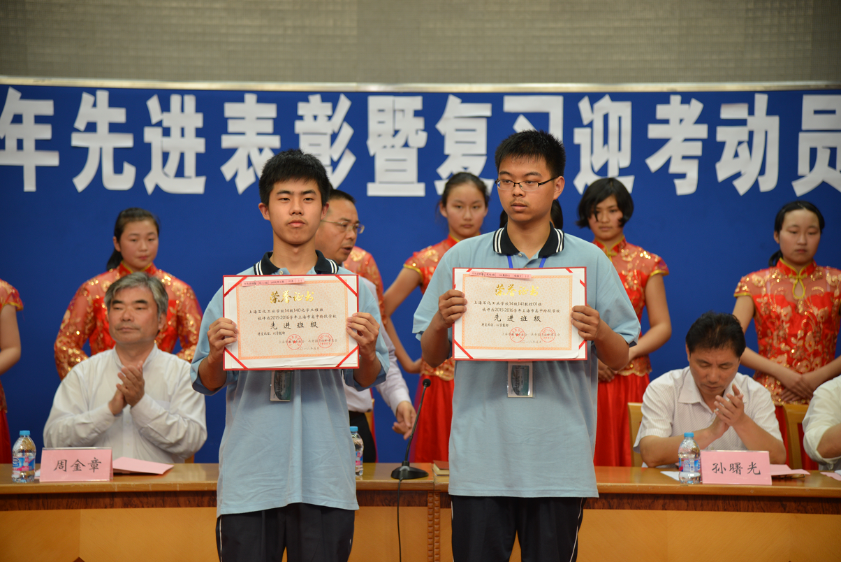 高炬宣布2015―2016学年先进集体、先进个人、上海市奖学金表彰名单。其中市级先进集体2个,区级先进集体10个,校先进班级7个,行为规范示范班7个,文明宿舍11个;市级先进个人1名,区级先进个人10名,校级先进个人82名,单项先进个人160名;创新之星10人,关爱之星33人,劳动之星72人,孝善之星27人,学习之星79人;校优秀团支部14名,上海市优秀团干部1名,金山区优秀团员2名,金山区优秀团干部2名,校优秀团员30名,校优秀团干部5名。