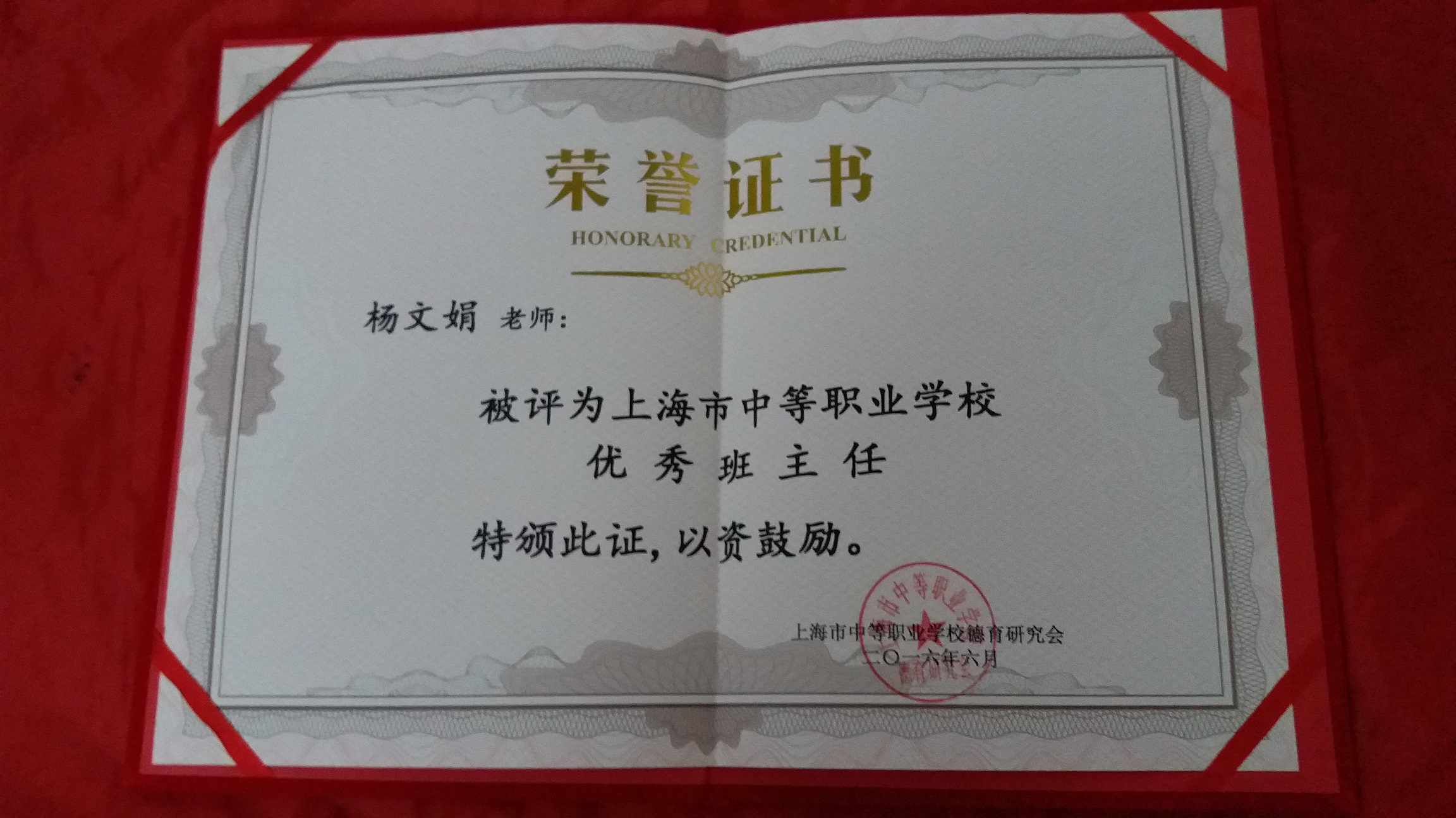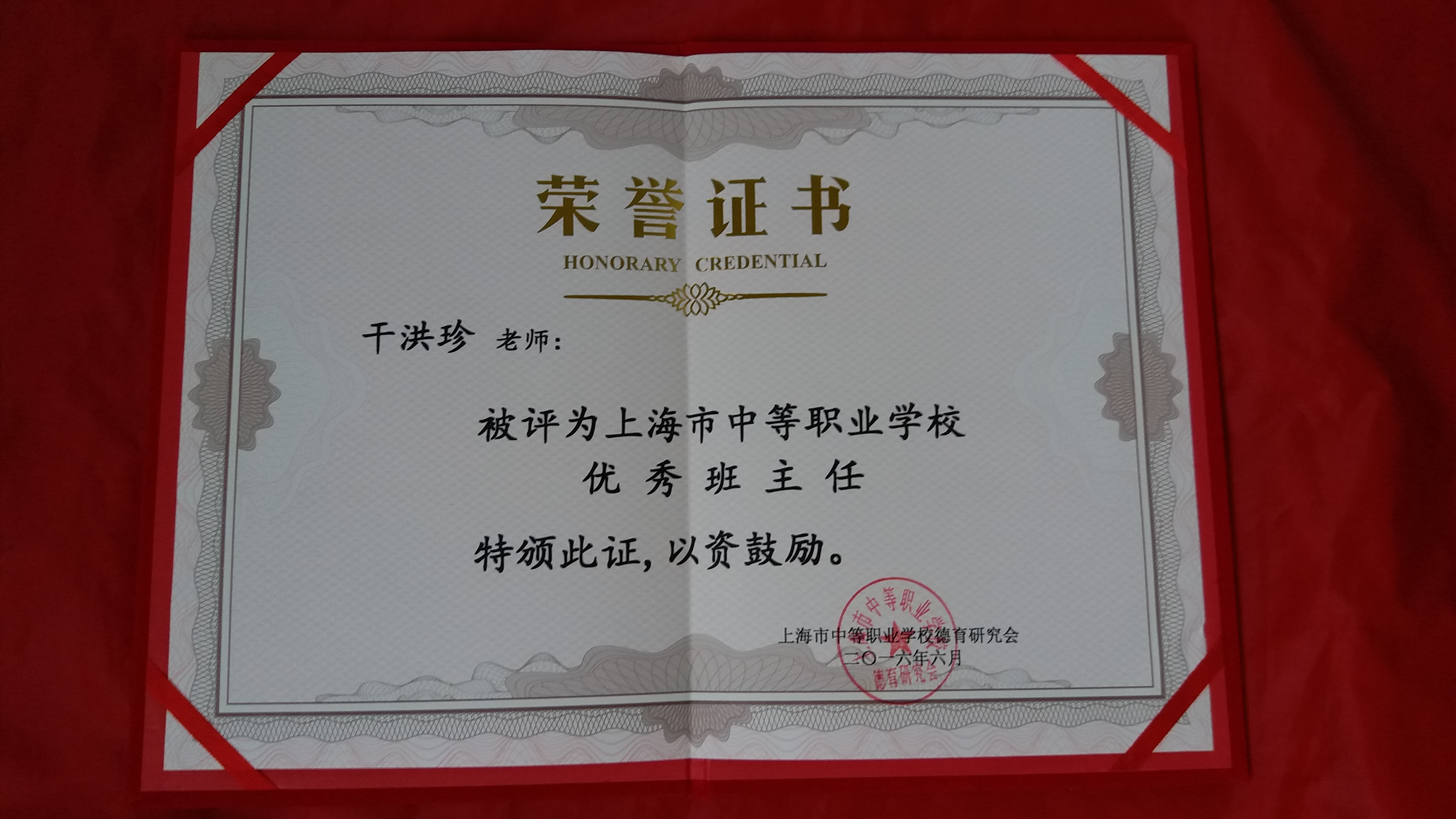 2016年7月,我校干洪珍、杨文娟两位老师被评为上海市中职系统优秀班主任,本次活动由上海市教育委员会德育处牵头,上海市中小学幼儿教师奖励基金会、市教委有关处室和上海市中小学德育研究协会组成市评选工作小组,负责评选工作。