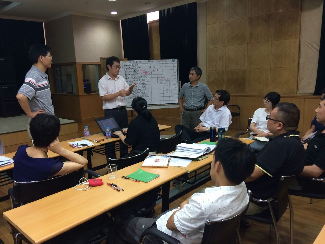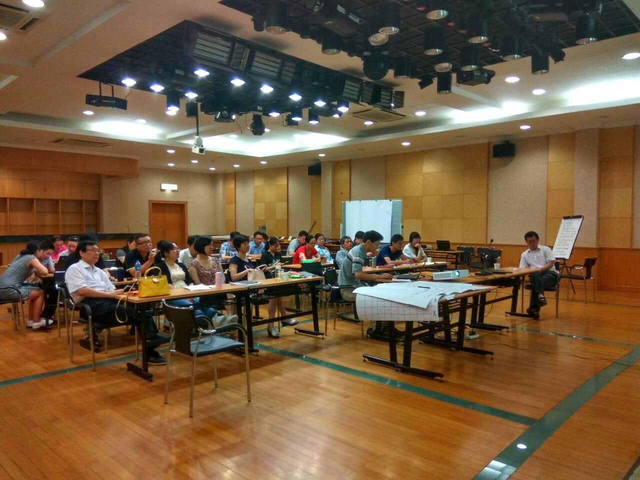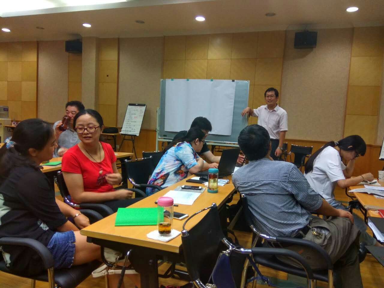 2016年7月14日上午9点,上海石化工业学校综合科技楼二楼,苏州健雄职业技术学院AHK双元制培训中心主任岳向阳老师正为我校教师开展着第四天的培训。