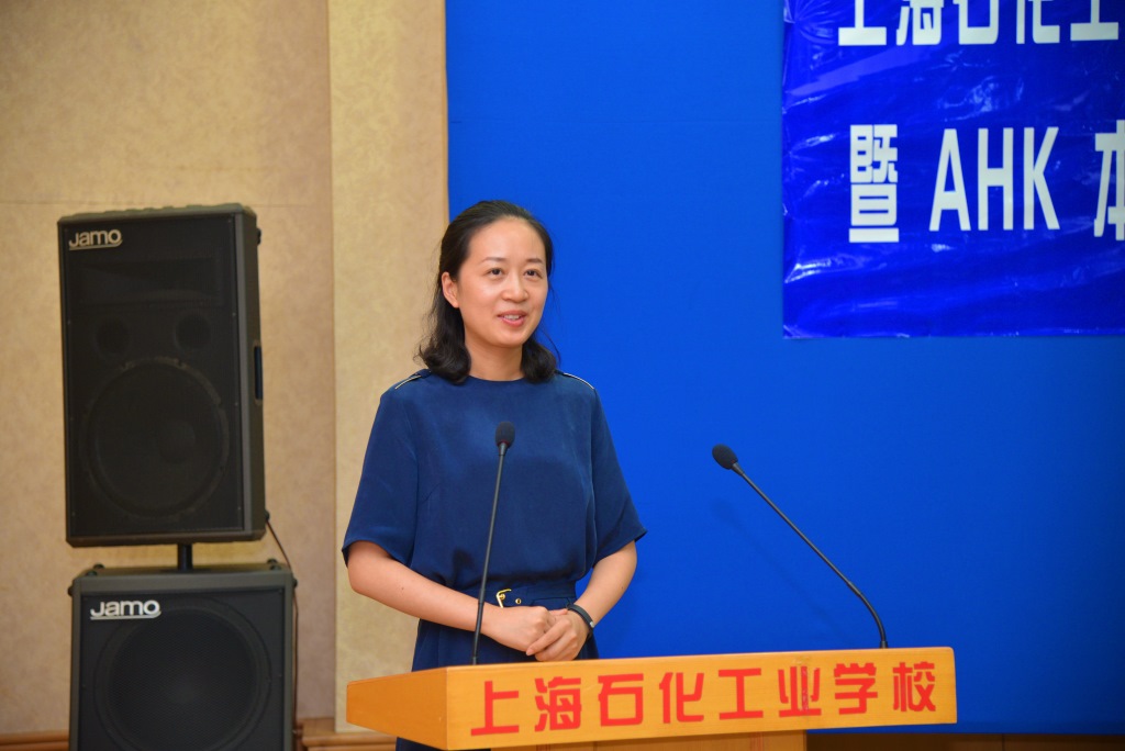 在签约仪式上,陈丽玮女士就德国工商大会的基本情况、德国工商大会驻中国代表处及项目合作案例作了介绍。她指出,根据德国行会法律制度和职业教育法律规定,所有德国境内企业必须加入德国工商会,德国工商会负责组织和协调德国本土商会和海外商会的职业教育活动;德国工商大会海外商会(简称AHK)是遍布全球的驻外机构,其中AHK上海代表处经德国政府授权,负责德国工商大会在中国境内的德国双元制职业教育体系合作。AHK的职业教育体系包括从战略层面统筹的职业教育委员会、陪伴双元制培训过程的能力小组和执行考试的考试委员会。AHK从战略层面统筹引进德国职业标准,通过组建的职业教育委员会进行中国本土化设计,并对职业教育的过程开展质量管理,并建立完全按照德国职业标准执行考试的考试委员会来指导考核。