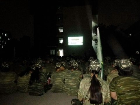 8月31日晚上,军训内容为“国防教育”课, 全体师生和教官在操场上观看了纪念60周年国庆电影《盛世大阅兵》。
