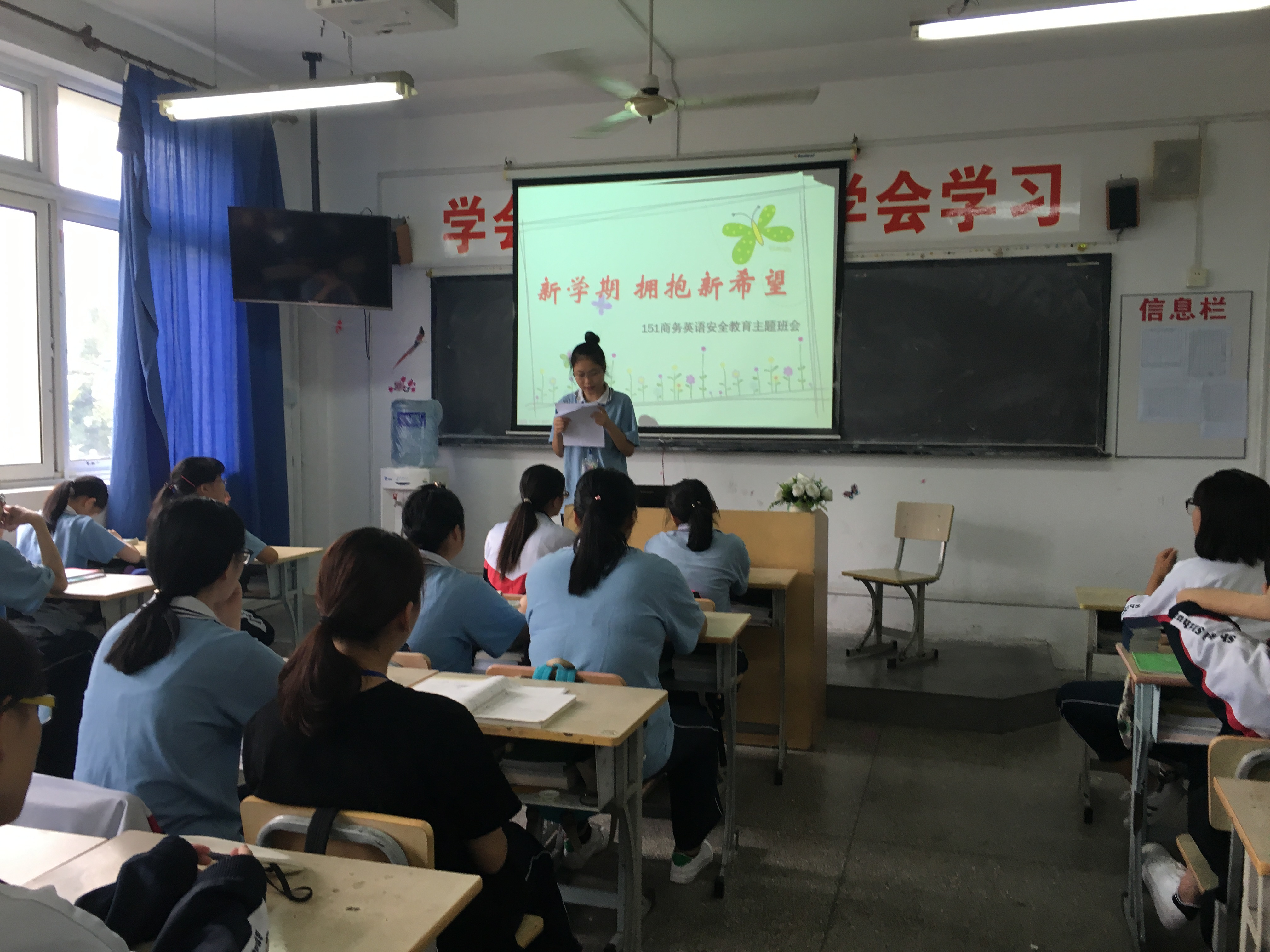 开学初往往是同学们纪律和安全意识比较淡薄的时期,也正是加强纪律和安全教育、强化纪律和安全管理的有利契机。在新学期开学第一天,151商务英语班召开了以“新学期,拥抱新希望”为主题的安全教育班会,旨在培养学生安全意识,创建良好班风学风,为进入正常有序的学习状态打牢基础。