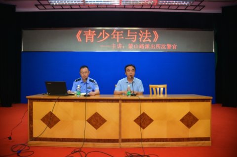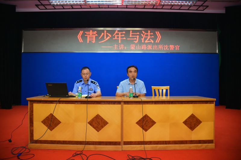 这次讲座邀请的是学校所属辖区蒙山路派出所沈警官,沈警官从事一线法制工作多年,也是我们学校的老朋友,非常熟悉我们学校的情况,因此,讲座一开始沈警官就和同学们拉起了家常,聊了聊去年给我们学校上好讲座后的感想。沈警官提到去年给我们学校上法制课后有两个没想到:第一是没想到课后学生们的反应热烈,因为举例的都是发生在同学们身边的案例,因此孩子们听得很认真;第二是没想到学校老师对沈警官的认同感也很强,认为上课的效果非常好,一段时间内校园的违纪情况少了好多。