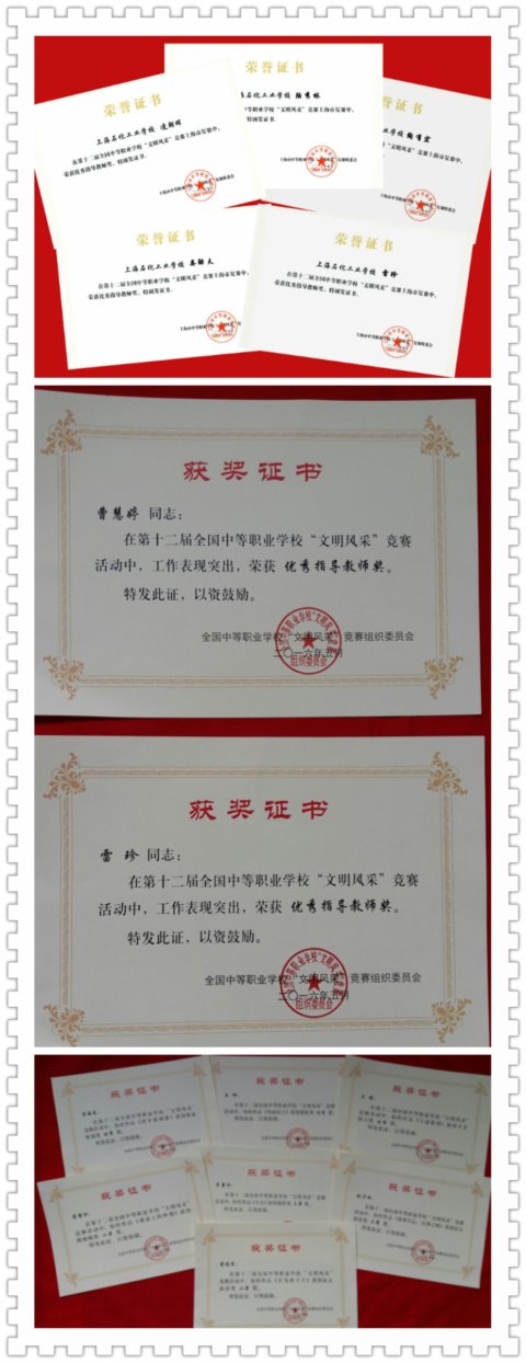 第十二届全国中等职业学校“文明风采”竞赛活动自2015年9月至2016年5月开展了校级初赛、市级复赛和全国决赛活动,历时半年的竞赛活动圆满结束。全国共有3974所学校、283.5万名学生、195.9万份作品参加校级初赛。在学校领导的大力支持下,经过全体师生的共同努力,我校喜获佳绩,在参赛的六大类15个项目中,曹慧婷、雷珍两位老师荣获全国优秀指导教师奖,陶有宏、雷珍、凌朝晖、陆秀林、娄劲夫五位老师荣获上海市优秀指导教师奖,近80位学生荣获一、二、三等奖。