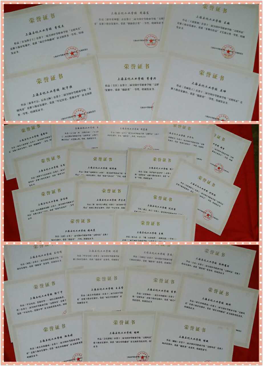 参加 “职业生涯规划”设计比赛。由德育室黄悦、田浩等老师组成指导小组,发挥德育课程“职业生涯规划”的主渠道作用,结合课程《生涯规划》,指导学生制订职业生涯发展规划,分析化工、机电、经贸等专业特点,从职业群的角度了解自己、了解社会,从自身条件、发展需要和经济社会、行业发展需要出发,分析到位、目标实在、台阶合理、措施翔实。同时开展“挥舞梦想翅膀”活动,引导学生规划职业目标的实现,制定具有针对性、明确性与可行性的目标实施计划,从中选择优秀作品参加上海、全国比赛。
