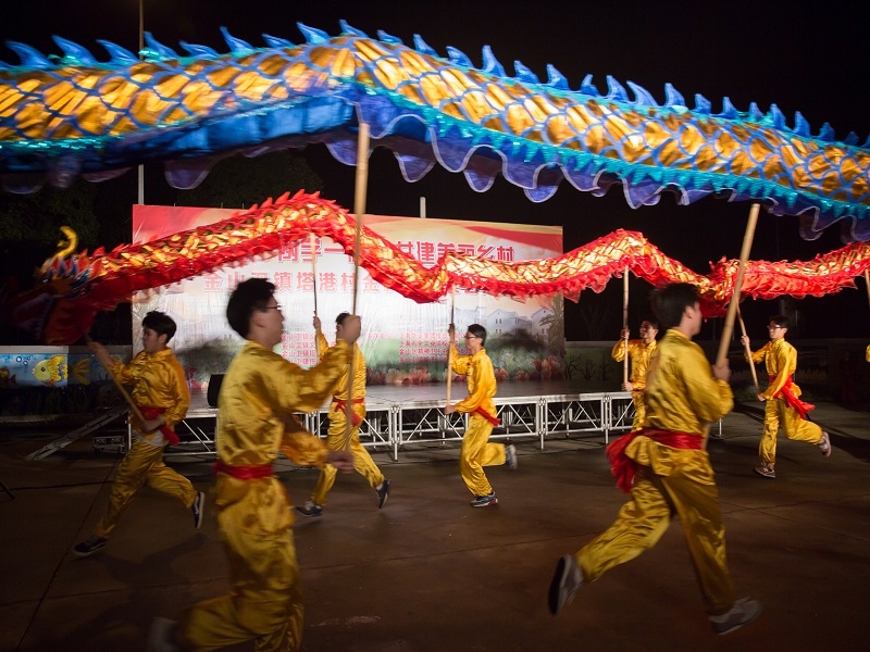 晚上18时活动准时开始,学生保障党支部书记潘志东代表学校列席了嘉宾席。在主持人介绍完领导与嘉宾后,演出正式开始。随着音乐响起,我校两条“大龙”开始了它的征程,游龙,八字,单跪,穿越,同学们对每个动作都烂熟于心,在座的领导与村民们拍手叫好,掌声连连,为同学们喝彩。紧接着,舞狮出场了,同学们把每只狮子演绎的栩栩如生,活灵活现,加之与大龙的的配合,整场演出气势如虹,让在场的所有人都振奋,激动。