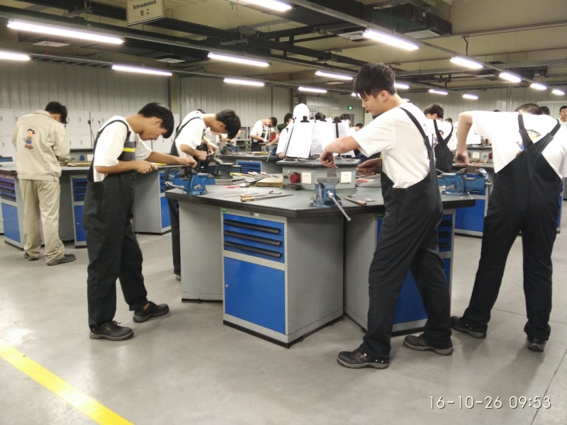 通过对两家德资企业的培训中心的调研,老师们比较深刻的体会是他完全采用德国双元制职业培训模式,以德国工商行会的行业标准培训专业技术工人;本土化实施应该体现在三张文凭证书,即只要通过德国商会组织学业考试,一张是AHK专业技术工人等级证书,一张是社会和劳动保障部门的四级等级工证书,还有一张是中等职业学校毕业证书;实训机械加工设备比较普通,在科学培训计划和管理下实训设备利用率非常高;学员培训作息时间与企业作息时间同步,学员提前适应企业岗位情景和感受企业文化;培训中心的实训环境布置企业化,安全标志张贴实训设备处,学员必须按安全规程操作。