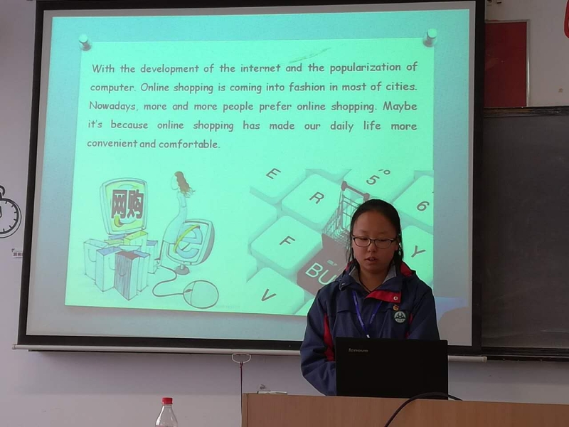 本次决赛以“My Views on Online Shopping”为题材,采用命题演讲的形式,要求参赛者提前制作演讲PPT,时间1-2分钟。具体评分要求:演讲内容主题突出、观点明确、结构清楚、逻辑性强(50分);演讲语言表达清晰明确、语法错误少、语音语调纯正流利(30分);辅助演讲的表现形式新颖,PPT制作符合商务特点(20分);评判总分为100 分。其中,151商务英语班的陆文浩同学在PPT演示时,以图文并茂的形式陈述自己的观点,声情并茂的讲述了网上购物的优点和缺点;161商务英语班的徐婉婷同学用PPT和视频的形式,向评委老师展示了我国电子商务发展正在进入密集创新和快速扩张的新阶段,网上购物是时代发展的产物和必然的需求。