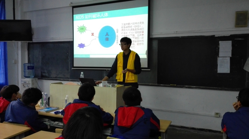 当同学们听到“艾滋病”三个字时,他们充满好奇又有些恐惧,这很正常。这是一堂特殊的课,但又是一堂我们这个年龄段不能回避的课,同时也是一堂严肃的课。同学们平时也或多或少听说过“艾滋病”,但对“艾滋病”又真正了解多少呢?我们有责任也非常有必要给他们进行相应知识的介绍和必要的防护。两位高校学长给同学们详尽的介绍了艾滋病的来龙去脉、传播途径、防护措施及对艾滋病人不能缺失的人文关怀。